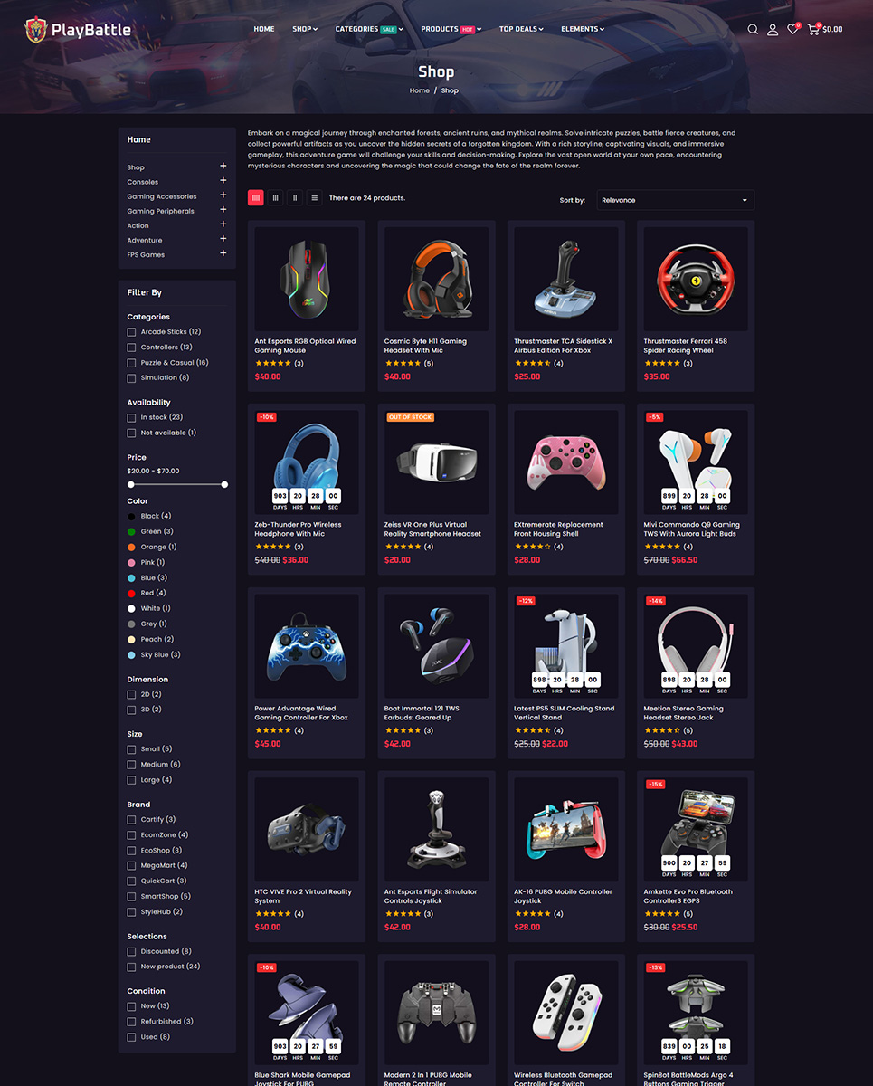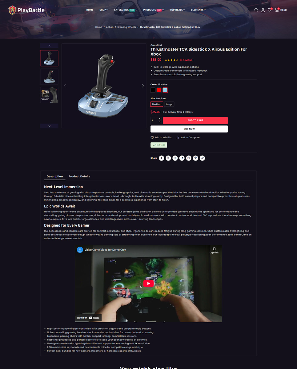 The Playbattle Prestashop theme is meticulously designed for gaming enthusiasts and gadget lovers who want a visually immersive and user-friendly shopping experience. This theme is ideal for online stores selling gaming accessories, consoles, high-tech gadgets, and e-sports merchandise. Packed with dynamic features and a modern design aesthetic, Playbattle ensures that your store stands out in the competitive gaming market.