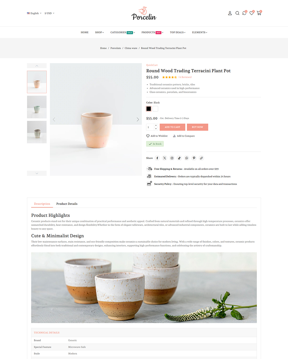 Create a modern eCommerce store with Porcelin - PrestaShop template to exhibit and promote your artistic products, handmade crafts, and similar ones. The theme is made with clear & uncluttered code & provides a rapid loading speed. Also, the theme is optimized for the latest SEO measures, all screen resolutions, and all the latest browsers. The theme involves a broad range of the latest eCommerce features to deliver an enjoyable user experience. Get Porcelin - a minimal yet modern template right away and build a stunning eStore with no hassle.