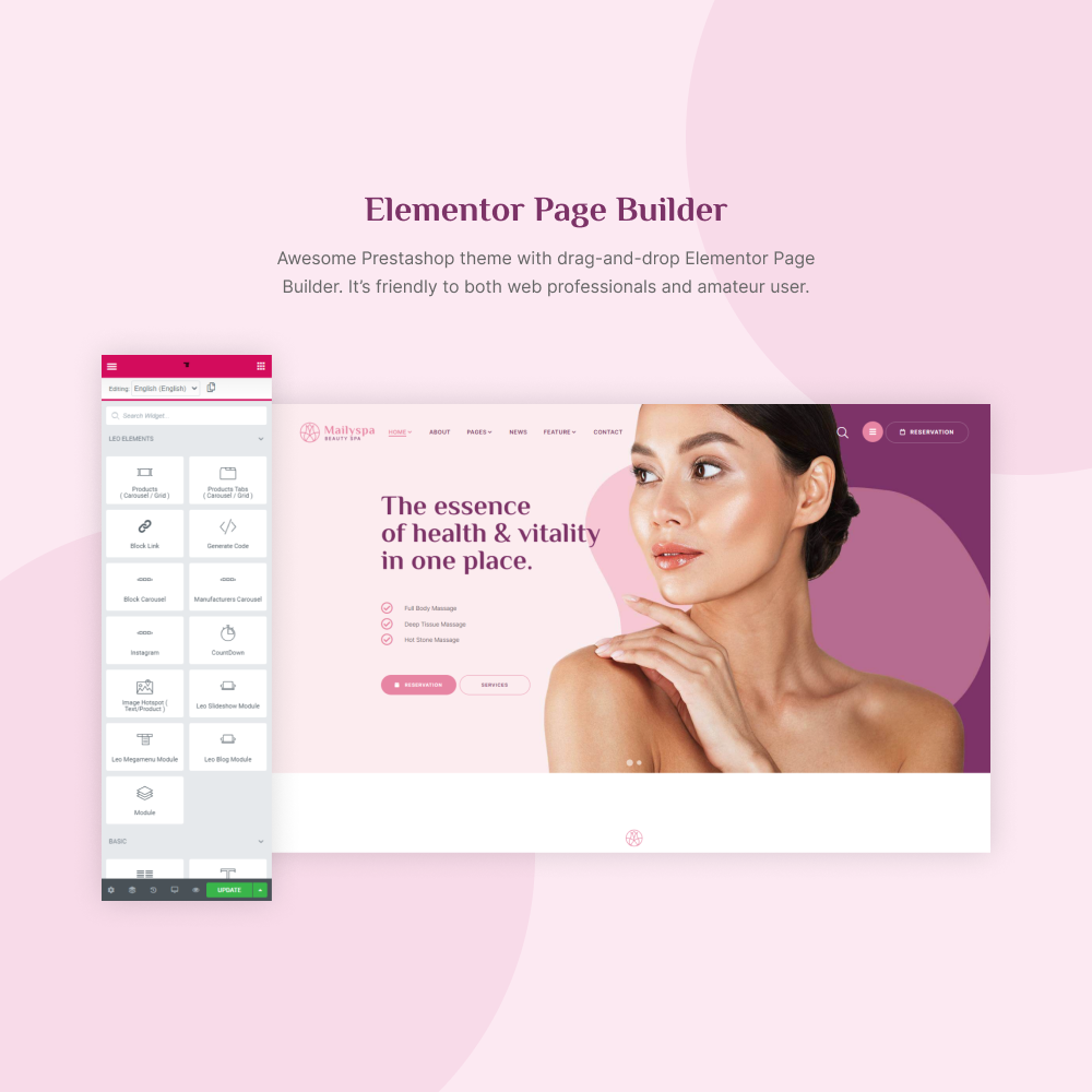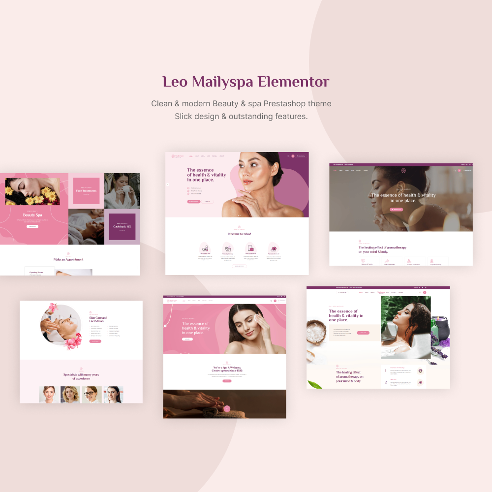 Ps Mailyspa Elementor – A Responsive Prestashop theme for Beauty & Spa is an exceptional addition to the latest Prestashop 8.x version. Meticulously crafted, this theme embodies exquisite design tailored for various online stores, including beauty spas, saunas, massage therapy, health care centers, spa treatments, skincare, and dry saunas. With its 100% web-responsive design, the Leo Mailyspa Prestashop theme ensures a stunning and professional appearance, offering high customization capabilities across all devices.