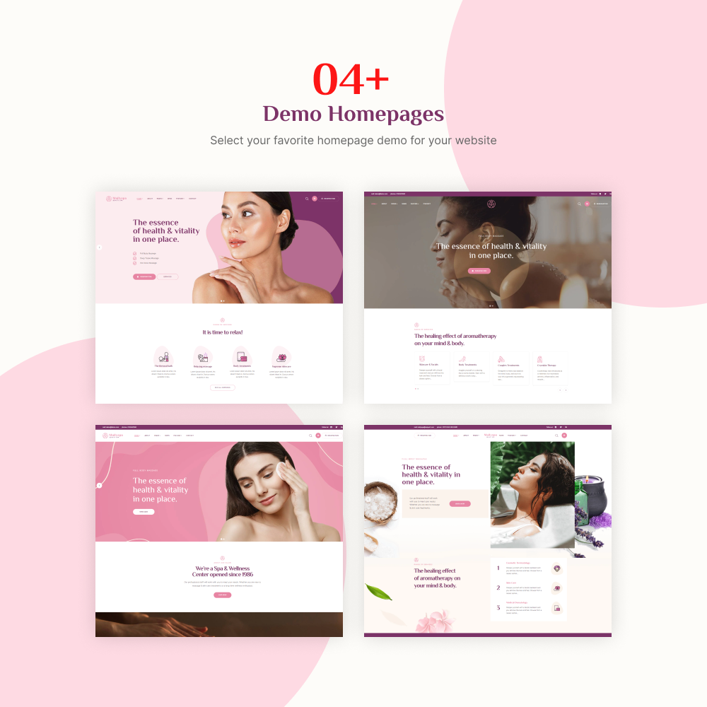 Featuring a selection of 04+ pre-defined homepage demos, you have the freedom to choose the perfect homepage that suits your needs. The Mailyspa Elementor beauty theme is both flexible and customizable, allowing you to effortlessly modify elements via Elementor page builder. You can easily personalize Google fonts and text colors without any coding, and the simple drag & drop functionality empowers you to design menus according to your preferences without the need for coding skills.