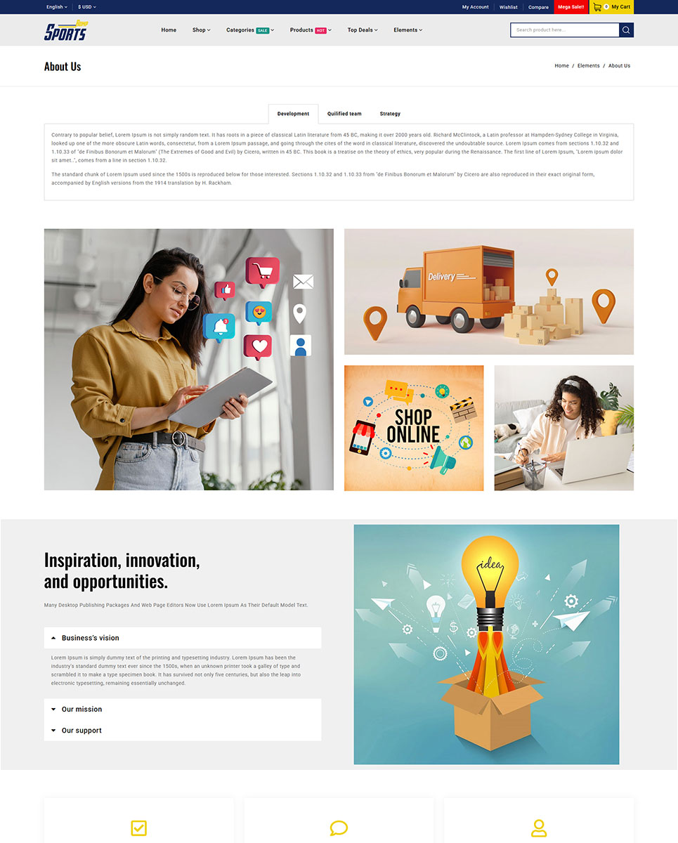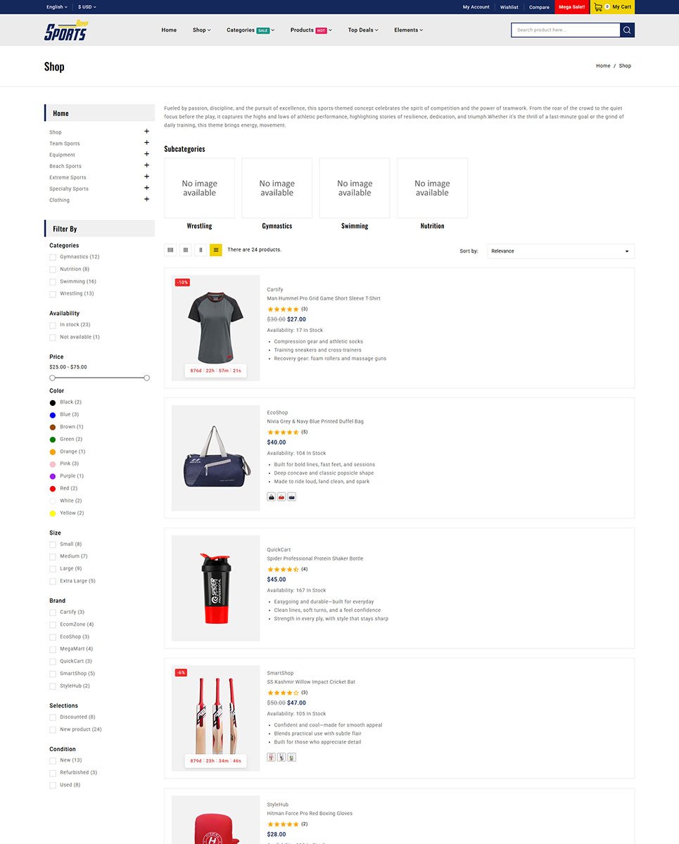 RompSports includes AJAX-powered features such as instant search, product filtering, and quick view for a seamless, fast-loading shopping experience. The Mega Menu Builder allows you to organize your categories and collections efficiently, giving visitors easy access to all product ranges.