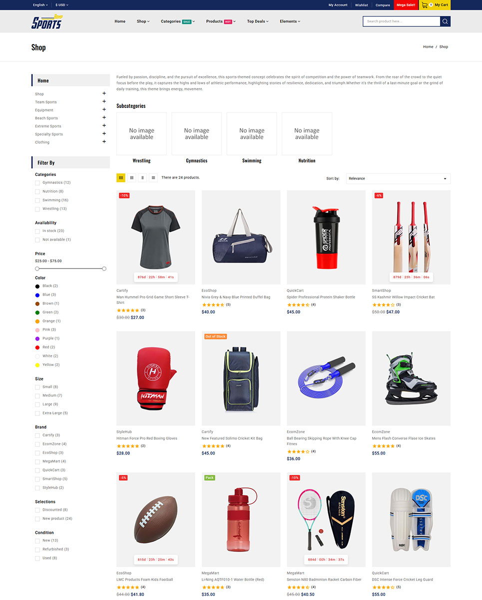 RompSports - Sports Game Store PrestaShop Responsive Theme is a dynamic and high-performance eCommerce theme specially designed for online sports shops, game stores, fitness gear, and athletic equipment sellers. With its bold and energetic design, RompSports helps you create a powerful online presence that captures the spirit of sports and competition.