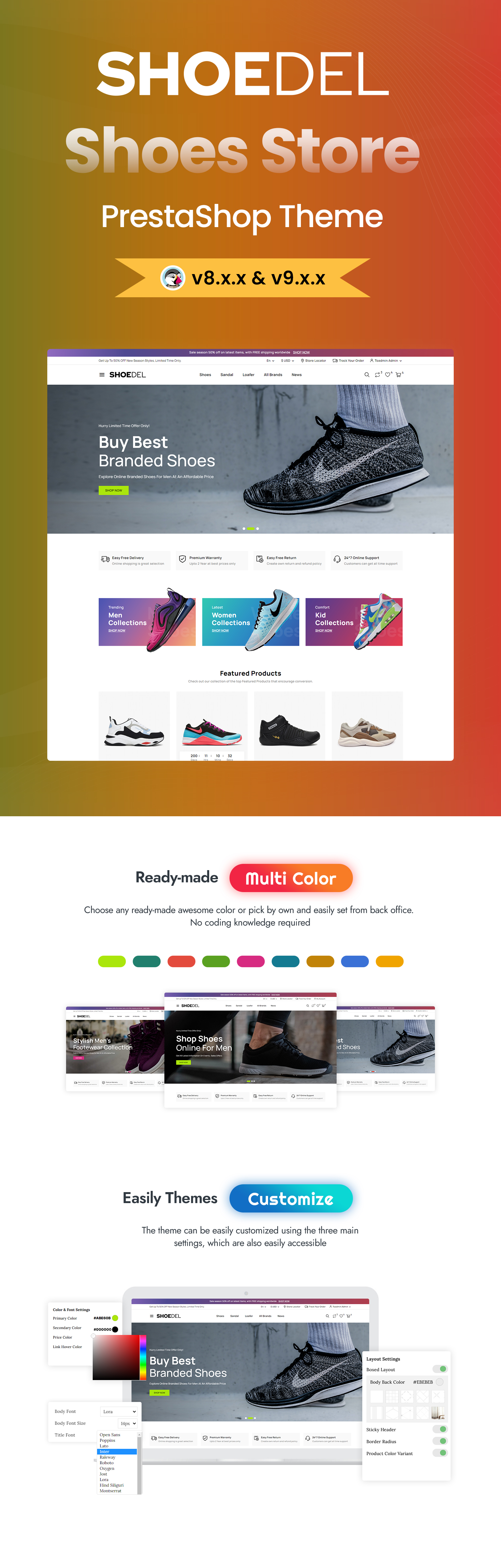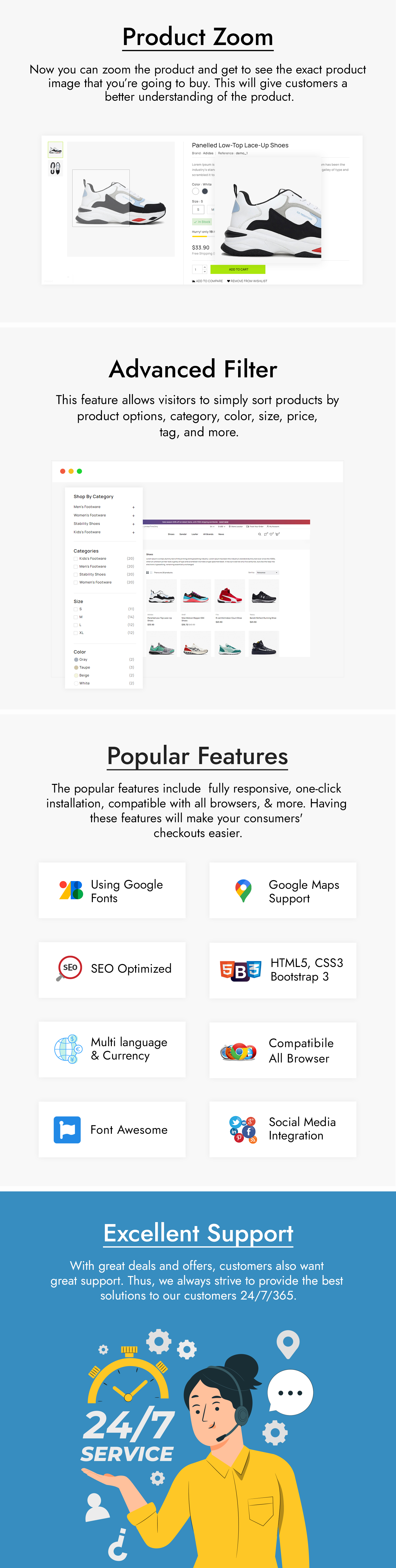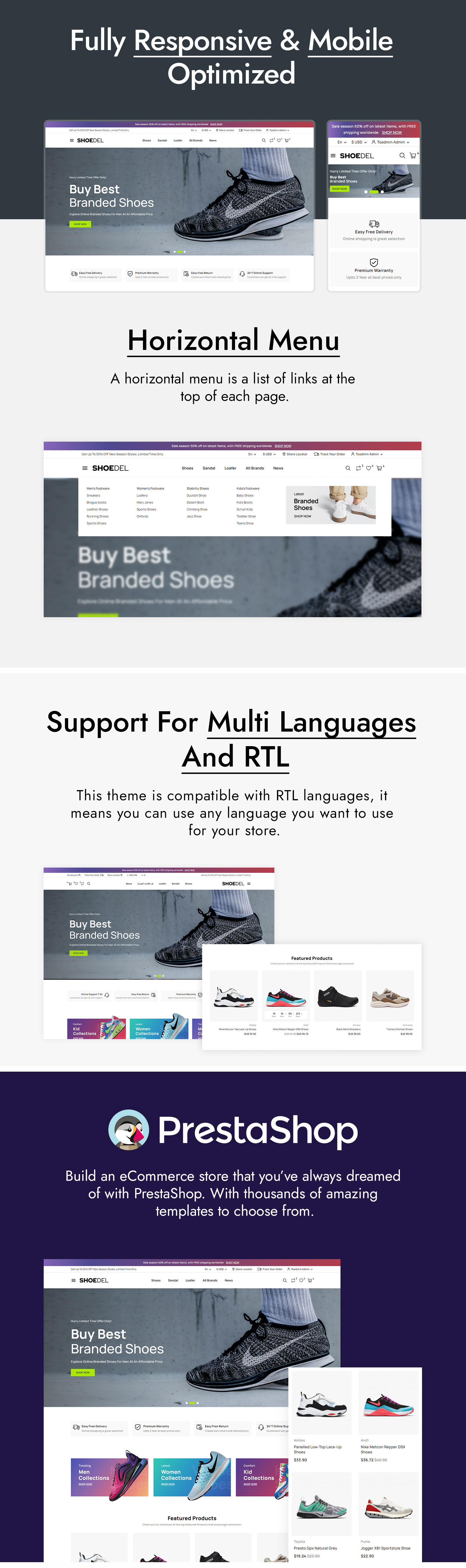 A committed team of developers committed to technical perfection is behind every great theme. The developers of the Shoedel Shoes Store PrestaShop theme are no exception; they regularly update and enhance the theme to keep it in line with current PrestaShop releases and industry standards. Additionally, they offer continuing assistance to help you overcome any difficulties and maximize the potential of the theme.