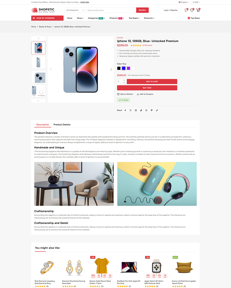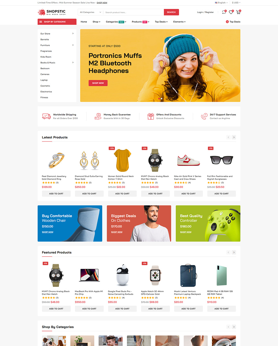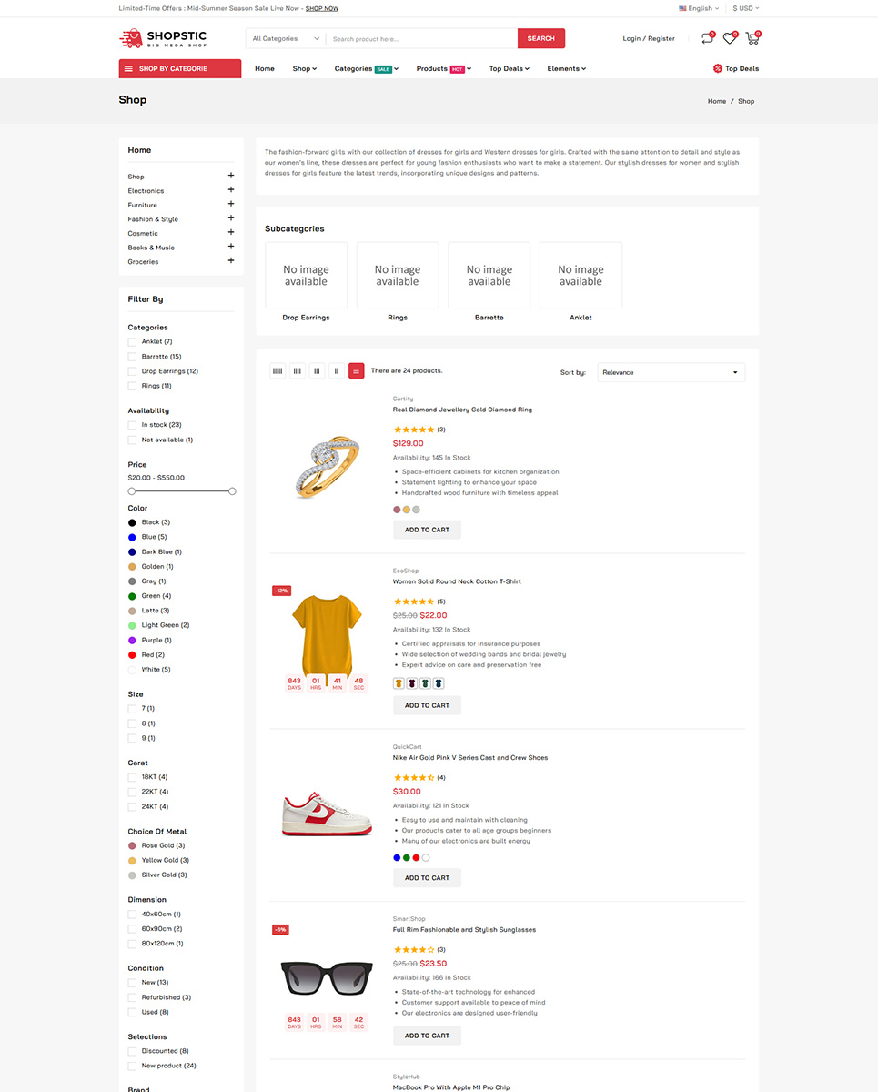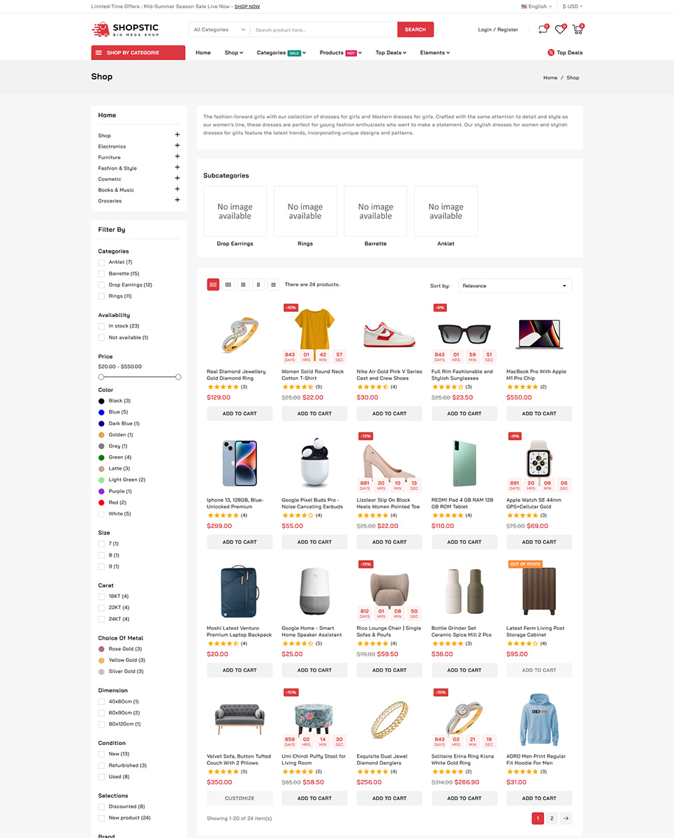 The homepage is thoughtfully arranged with promotional banners, product grids, category showcases, and spotlight sections, helping customers explore different departments at a glance. Its Mega Menu system makes navigation simple and structured, allowing you to neatly organize multiple product categories and highlight featured collections or offers. This is especially beneficial for stores with large catalogs, ensuring that every product remains easy to find.