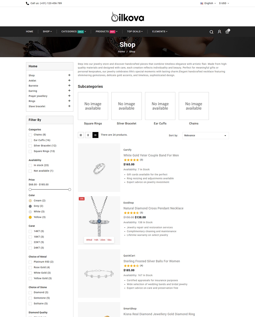 Silkova - Jewelry Fashion Store PrestaShop Theme is a refined and elegant eCommerce template tailored for online jewelry stores, fashion accessory boutiques, and luxury lifestyle brands. With its sophisticated design and polished layout, Silkova helps you present high-end products like rings, necklaces, bracelets, and watches with exceptional style and clarity.