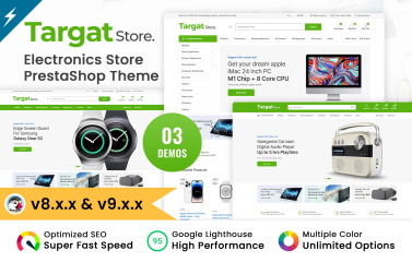 The Targat PrestaShop Multipurpose Electronics theme was created after extensive research into current website trends. The Targat layout design is a perfect match for electronic items including smartphones and digital products. Each component of the Targat theme was carefully crafted to produce a comprehensive, expert website for an electronics store. Using the Targat theme, quickly and very easily change or edit fonts and theme colors. Targat theme is additionally constructed using cutting-edge web technology and a modern, fresh style.