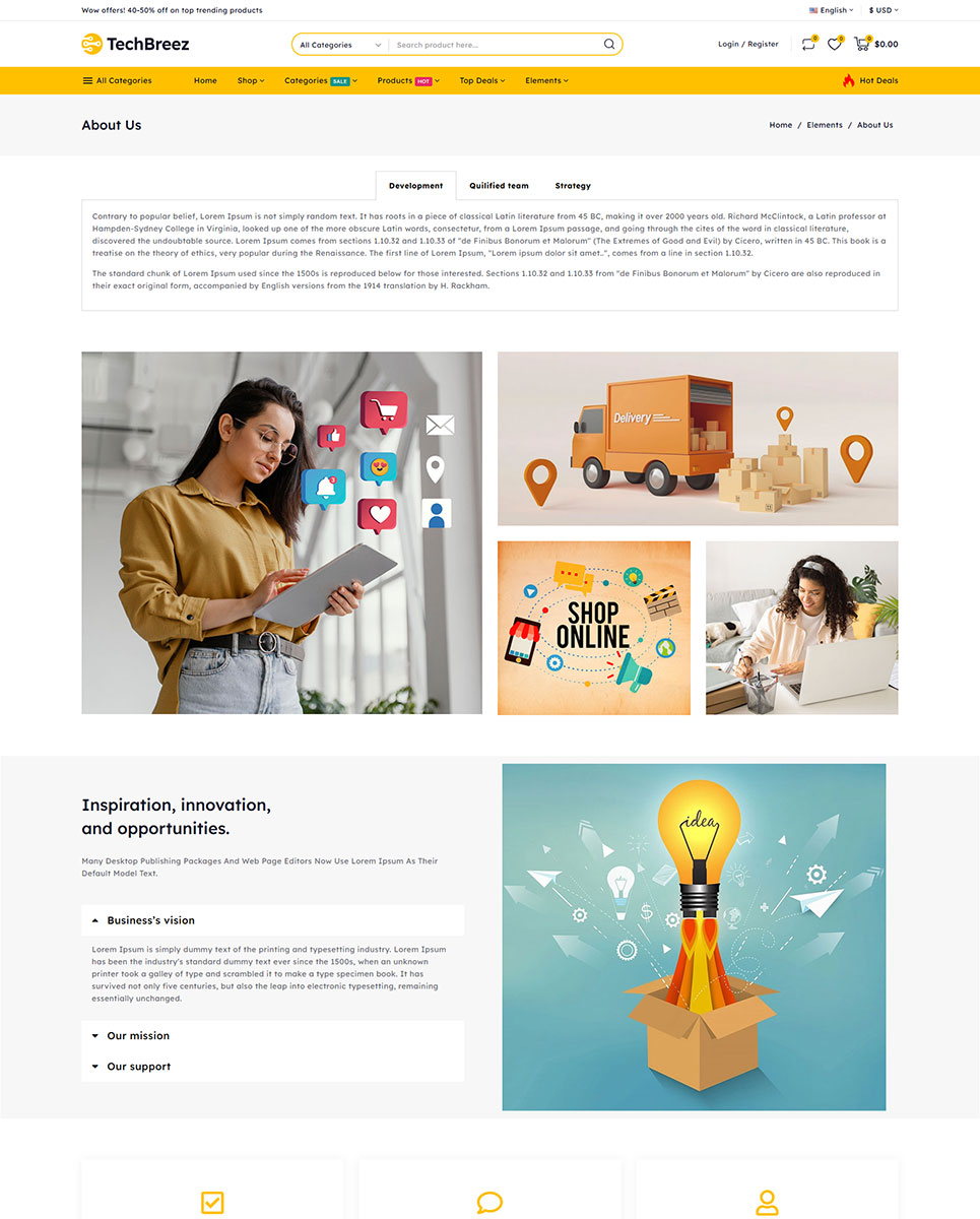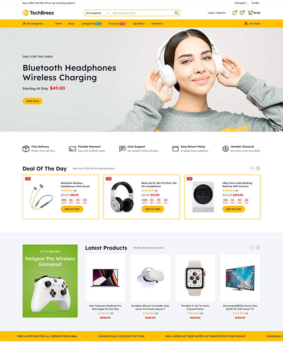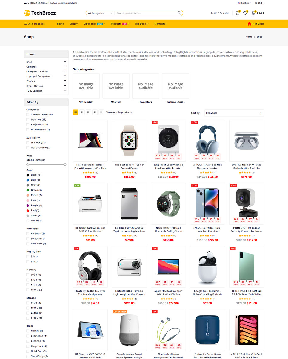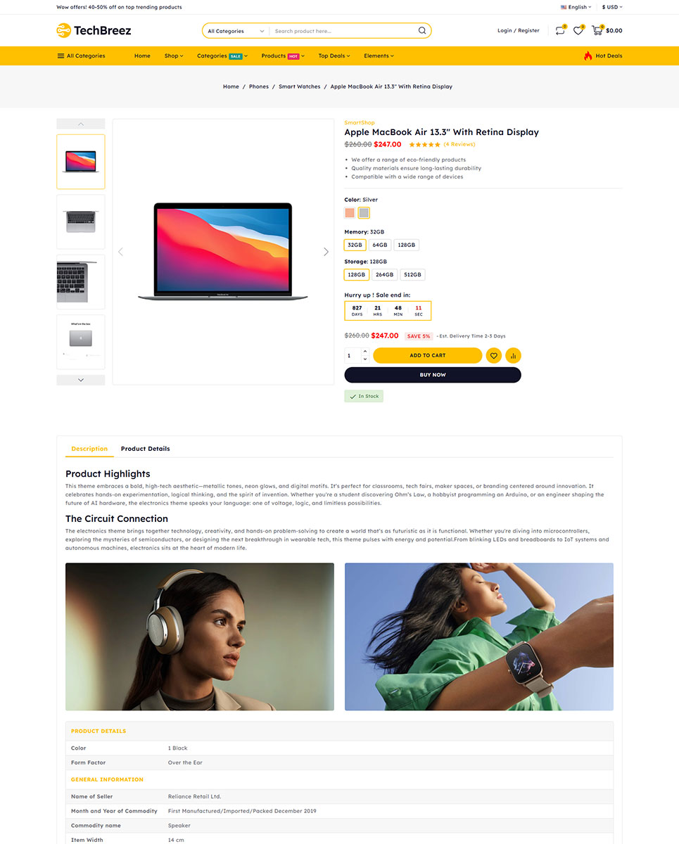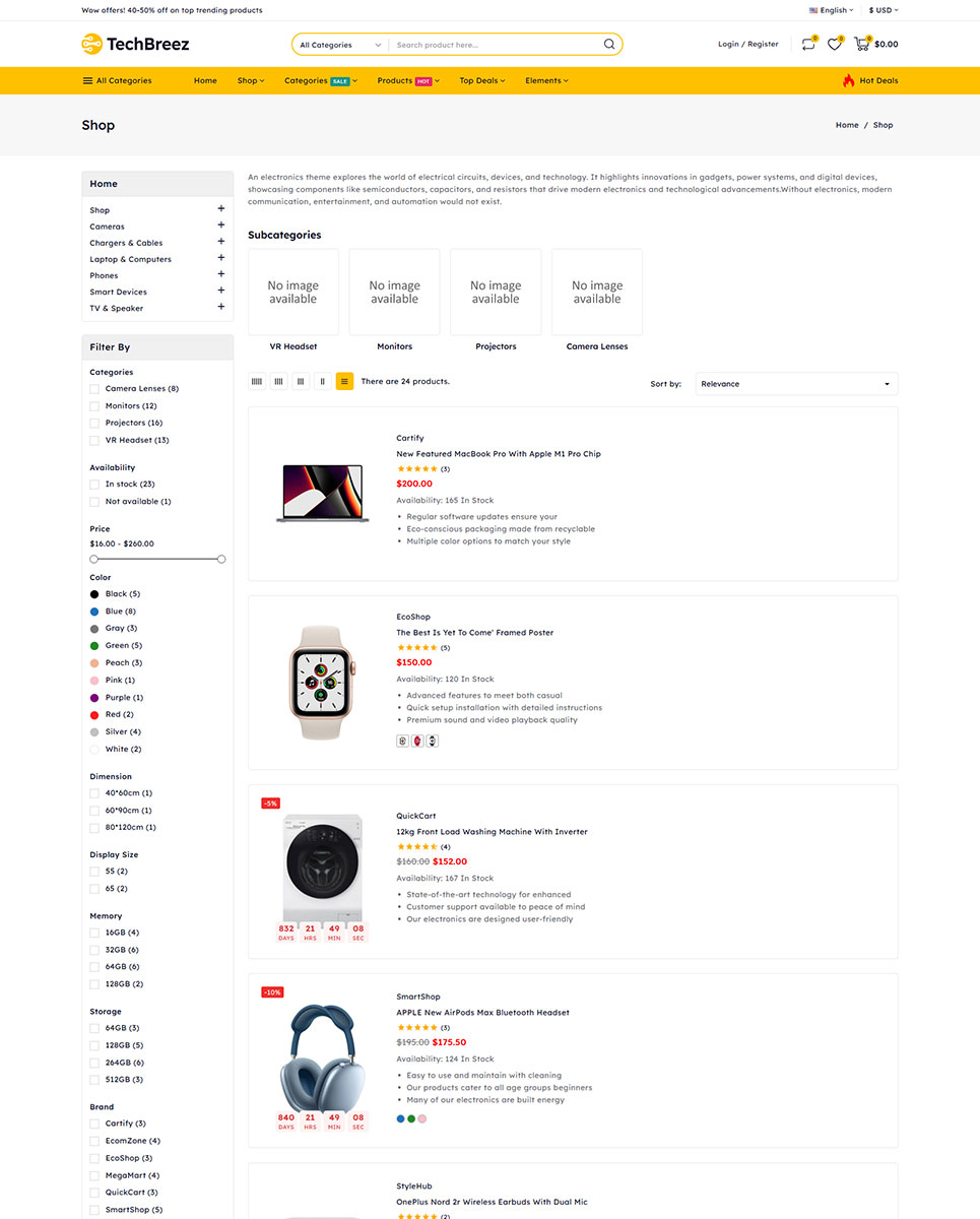 The theme includes a Quickstart Installation Package, helping you launch your store quickly by replicating the demo setup in just a few steps. With the smart Mega Menu Builder, you can create structured and visually engaging navigation menus to highlight categories, brands, featured products, and exclusive deals. Enhanced with AJAX-powered features like real-time search, quick view pop-ups, product filtering, add-to-cart updates, and smoother page interactions, Techbreez ensures a faster and more engaging shopping experience.