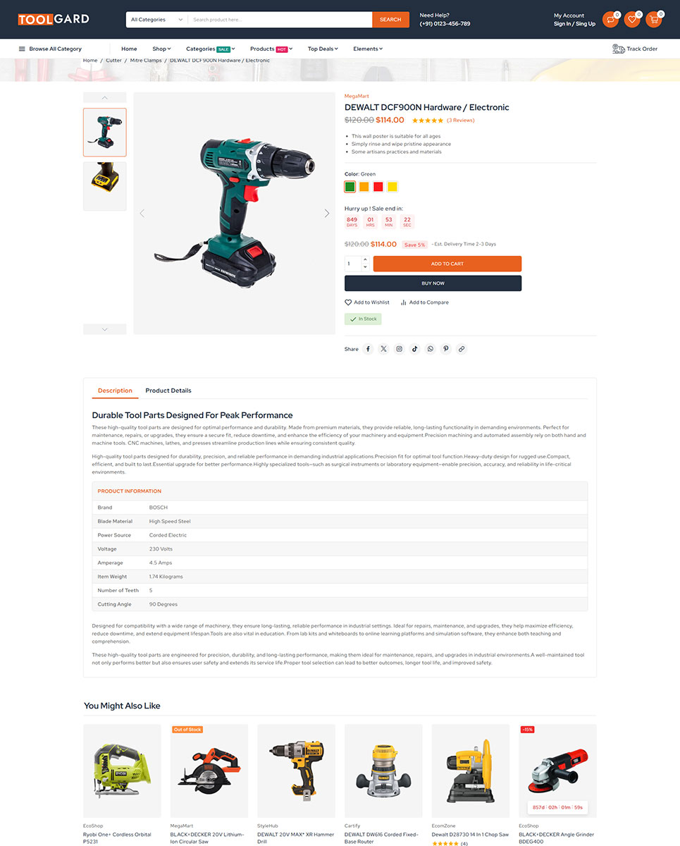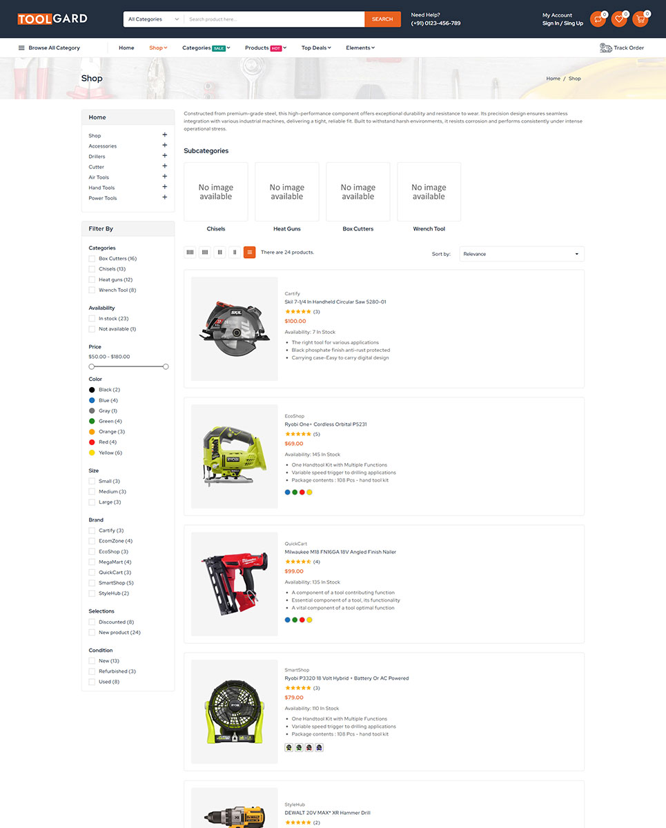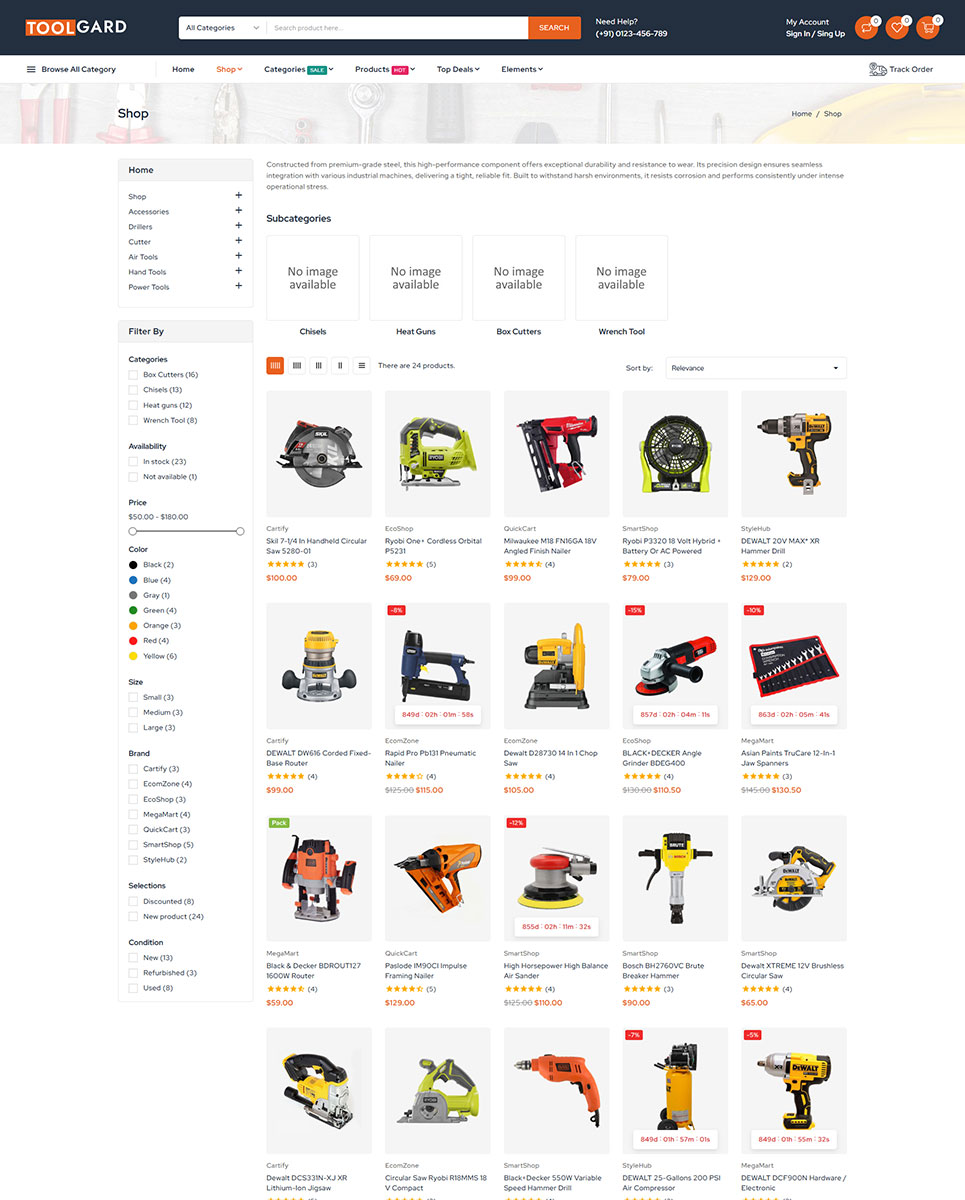 Toolgard Mega Tools Store is a fantastic Prestashop theme built with the prestashop latest version. This theme is perfectly designed to be suitable for Tools, Auto parts, Machine accessories, Industrial tools, Electronics item and many other products.