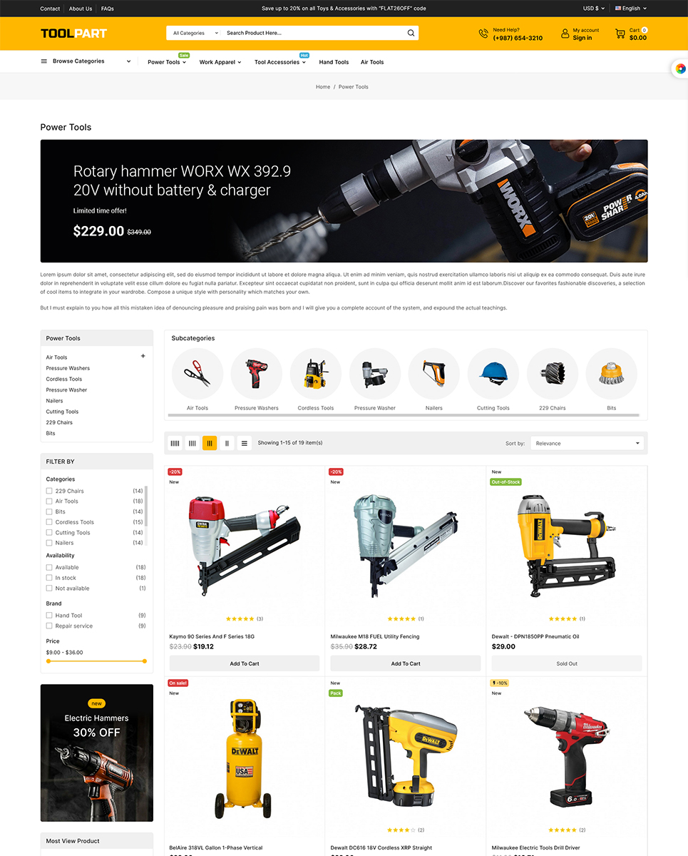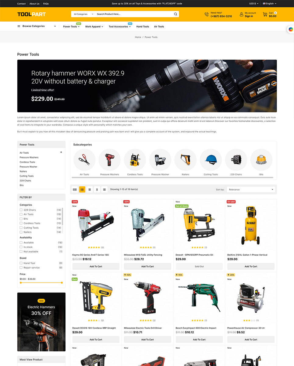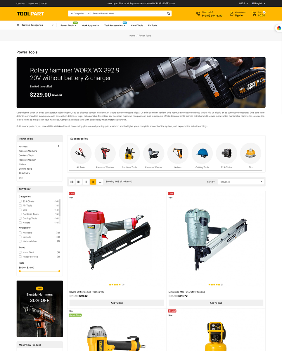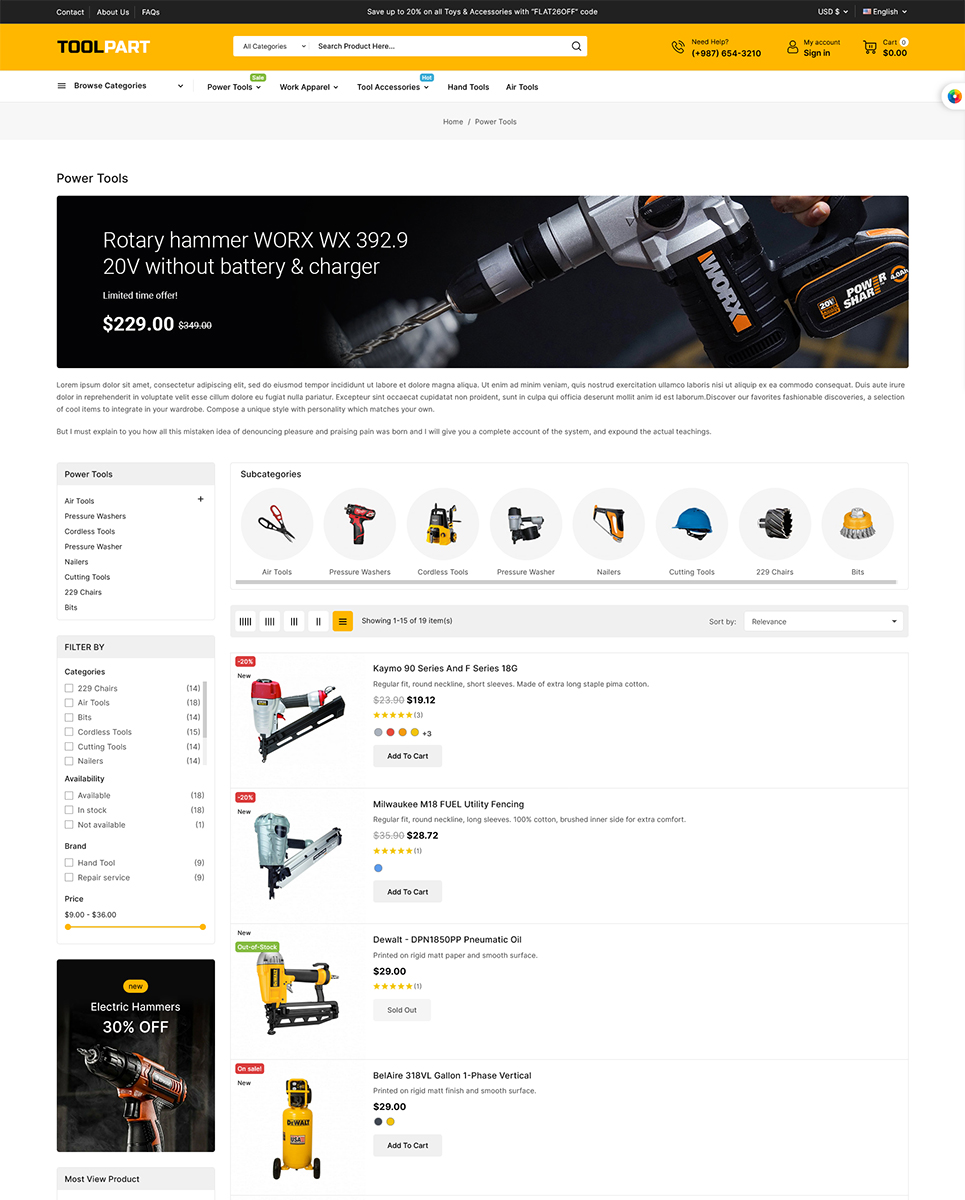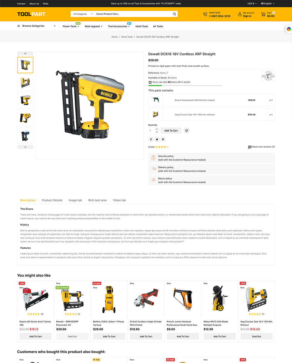 Functionality: 1. Responsive Design: ToolPart is fully responsive, ensuring that your online store looks great and performs flawlessly on all devices, including desktop computers, tablets, and smartphones. This responsive design provides an excellent user experience and helps you reach a wider audience.