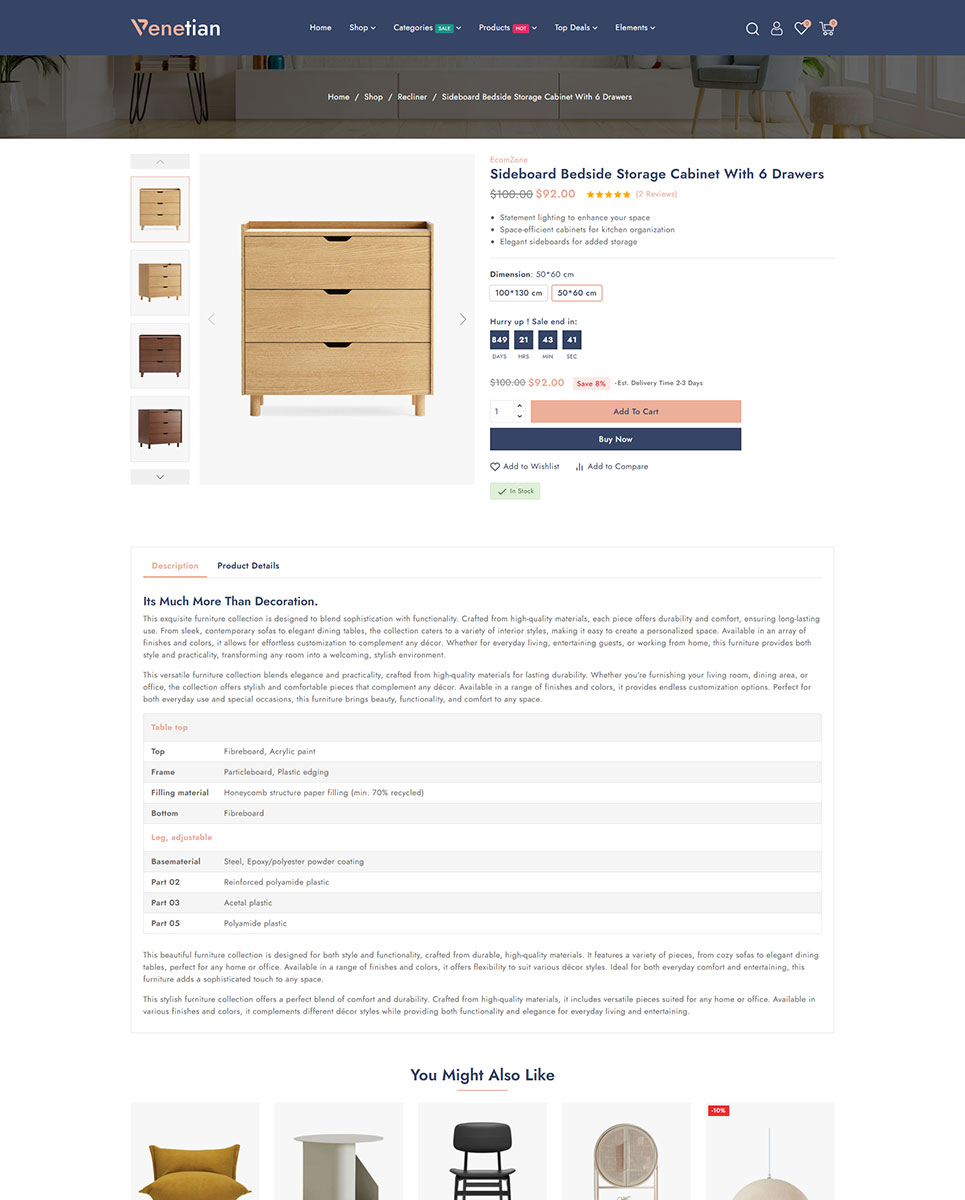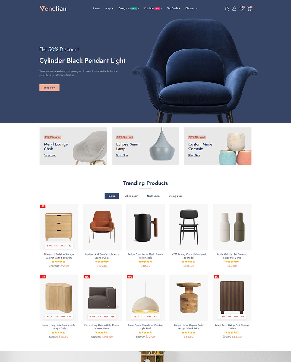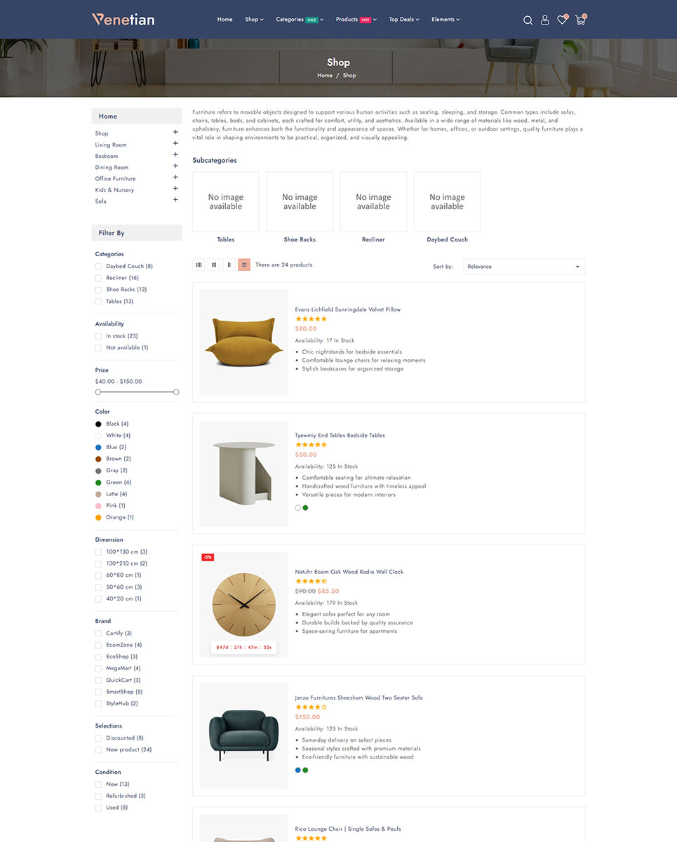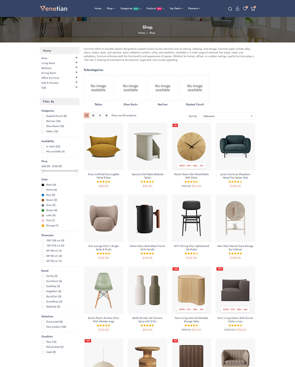 With SEO optimization, fast-loading performance, and a quickstart installation package, Venetian ensures that your online store not only looks premium but also performs efficiently. Whether you’re selling luxury sofas, modern furniture, lighting, or decorative accents, Venetian gives your business the perfect blend of elegance, usability, and professional design to turn browsing into buying.