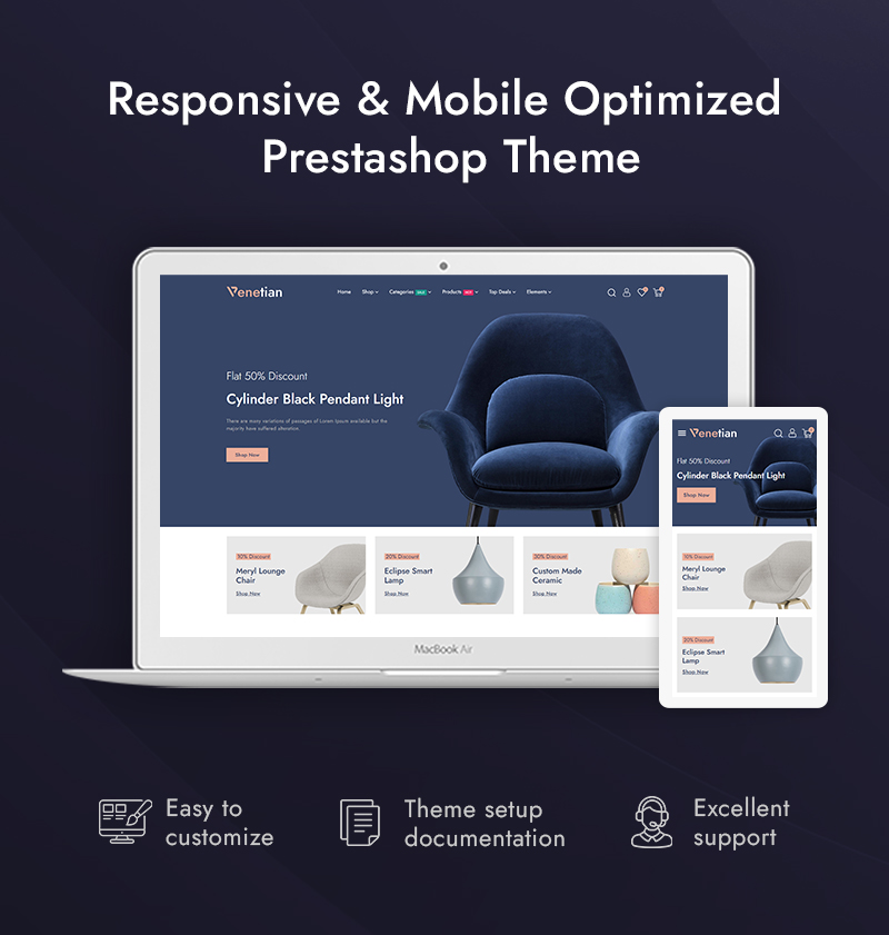 Venetian – Furniture & Home Decor Store Prestashop Responsive Theme is a stylish and modern eCommerce solution crafted for furniture shops, home decor brands, interior designers, and lifestyle stores. Designed with elegance and functionality in mind, Venetian helps you build a visually stunning online store that highlights your furniture collections, decor pieces, and home accessories with sophistication.