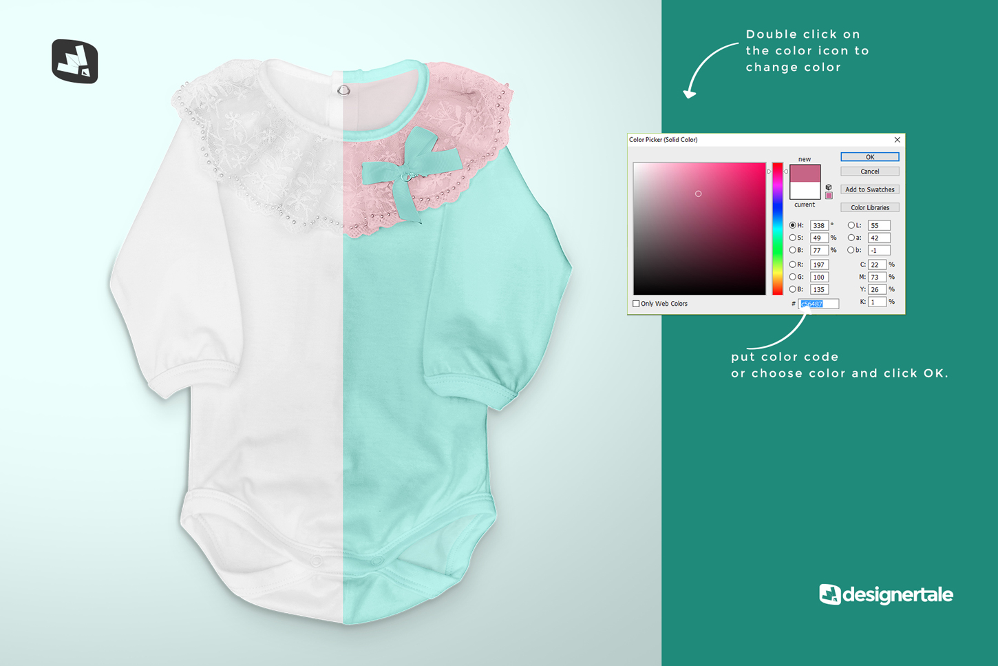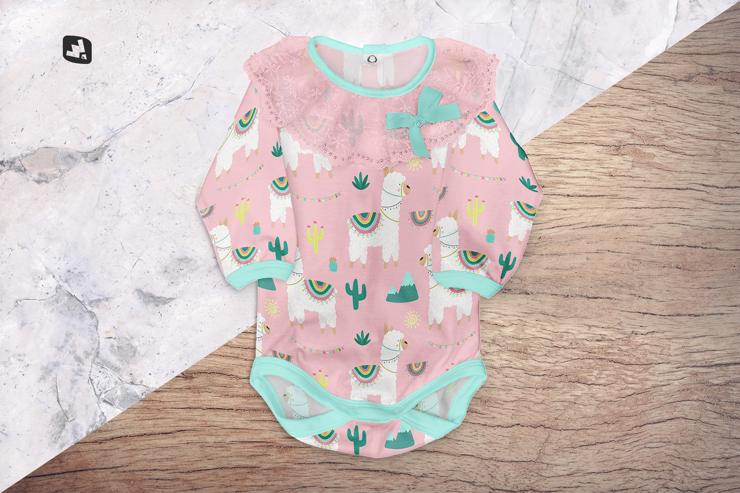 Baby clothes are cute and beautiful. This baby girl’s onesie mockup is a ruffled collar romper. This baby girl’s onesie mockup is a professional and simple way to present your cute pattern designs. This newborn romper mockup has a high-resolution base image. The ruffled collar and fabric texture give this onesie mockup a photo-realistic effect. The guide video provided with this infant apparel mockup is detailed and helps you edit like a pro. A truly collective item to have in hands.