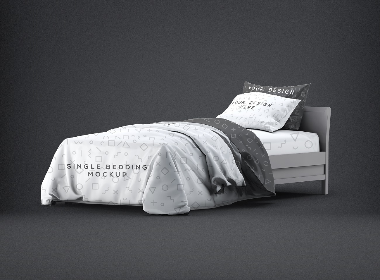 The Single Bedding Mockup showcases a cozy and inviting bedroom setting. The elegantly designed bed, draped in soft, high-quality sheets and a plush comforter, creates a tranquil ambiance. The carefully arranged pillows and neatly folded blanket exude comfort and attention to detail. This mockup presents an ideal representation of a single bed, perfect for showcasing bedding designs or creating a serene atmosphere for any visual project.