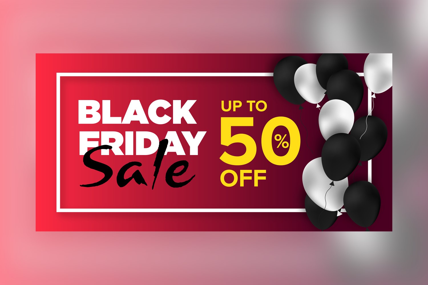 Black Friday Sales Banner with 50% Off Black and white Balloon Red Color Background Template Product Mockup