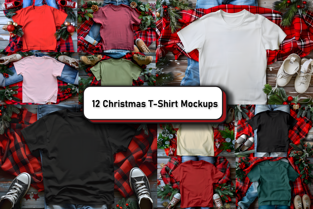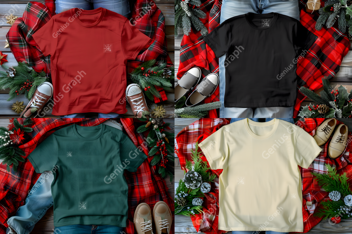 Bella Canvas 3001 Christmas T-shirt Mockup Bundle, Christmas Season Mockups, T-Shirt Mockups On Wooden Background.