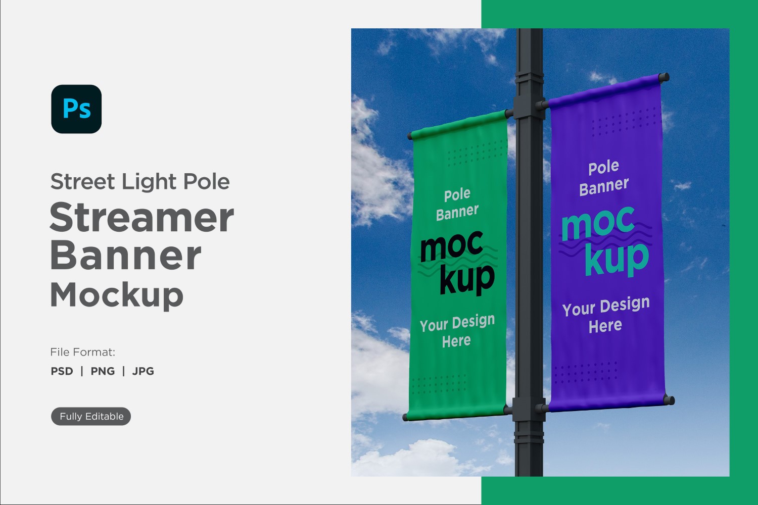 Streamer Pole Banner, Suspended with Street Light Advertising Banner Mockup