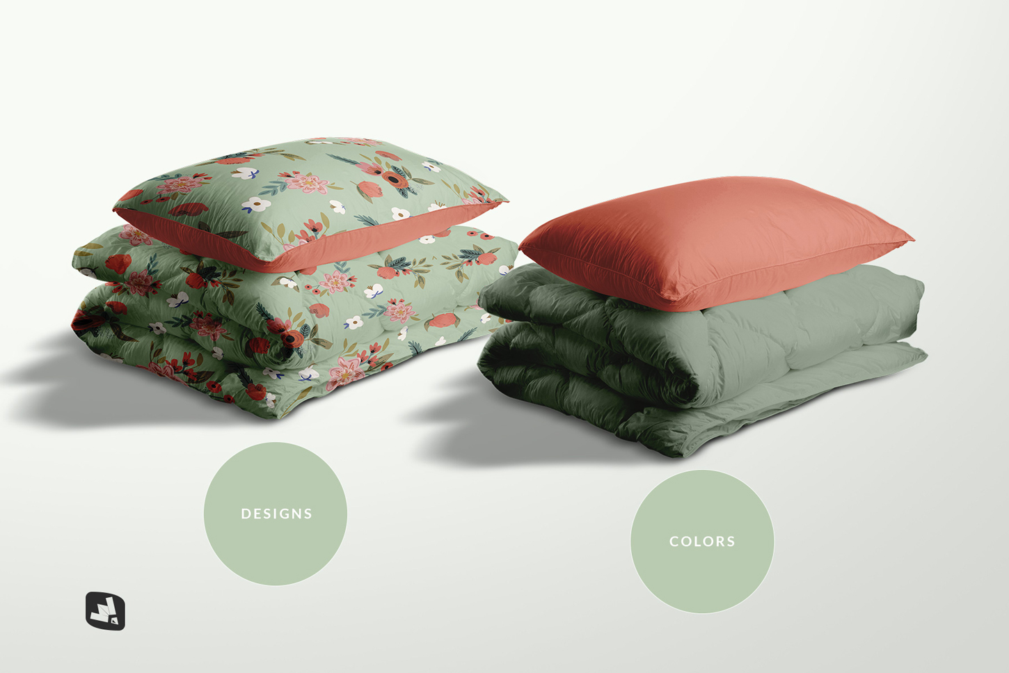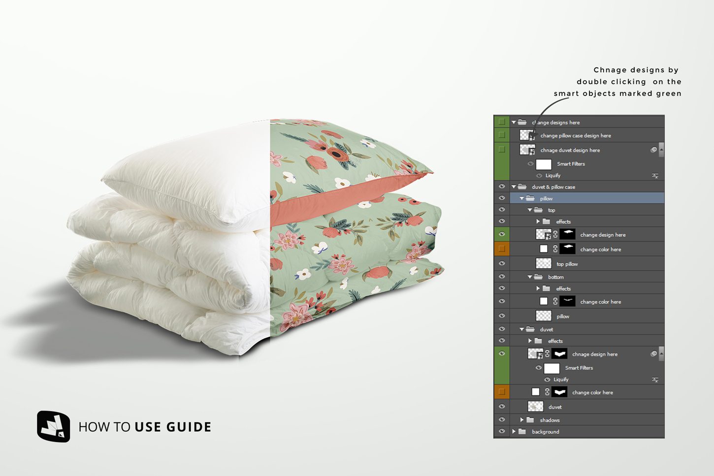Pillows and bedding are our daily necessities. This duvet & pillow case mockup is a great option for you to showcase your beautiful pattern designs. This duvet & pillow case mockup is simple and effective. The bedding mockup is high resolution and the prominent texture of the fabric gives it a great photo-realistic effect. The duvet and pillow cover mockup comes with a guide video to help you edit smoothly and makes your work process faster.