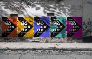 Five Crumpled & Glued Poster Mockup with shadow