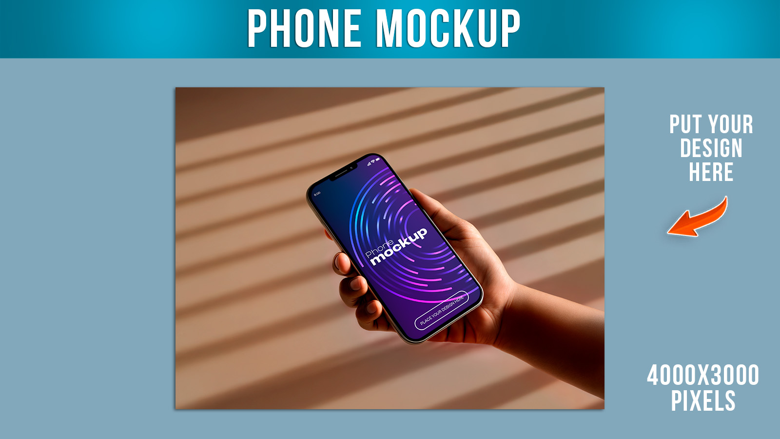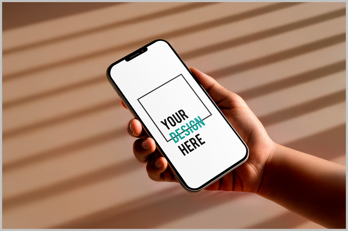 Hand Holding Smartphone Mockup lets you quickly apply designs using layers, masks, and smart objects.