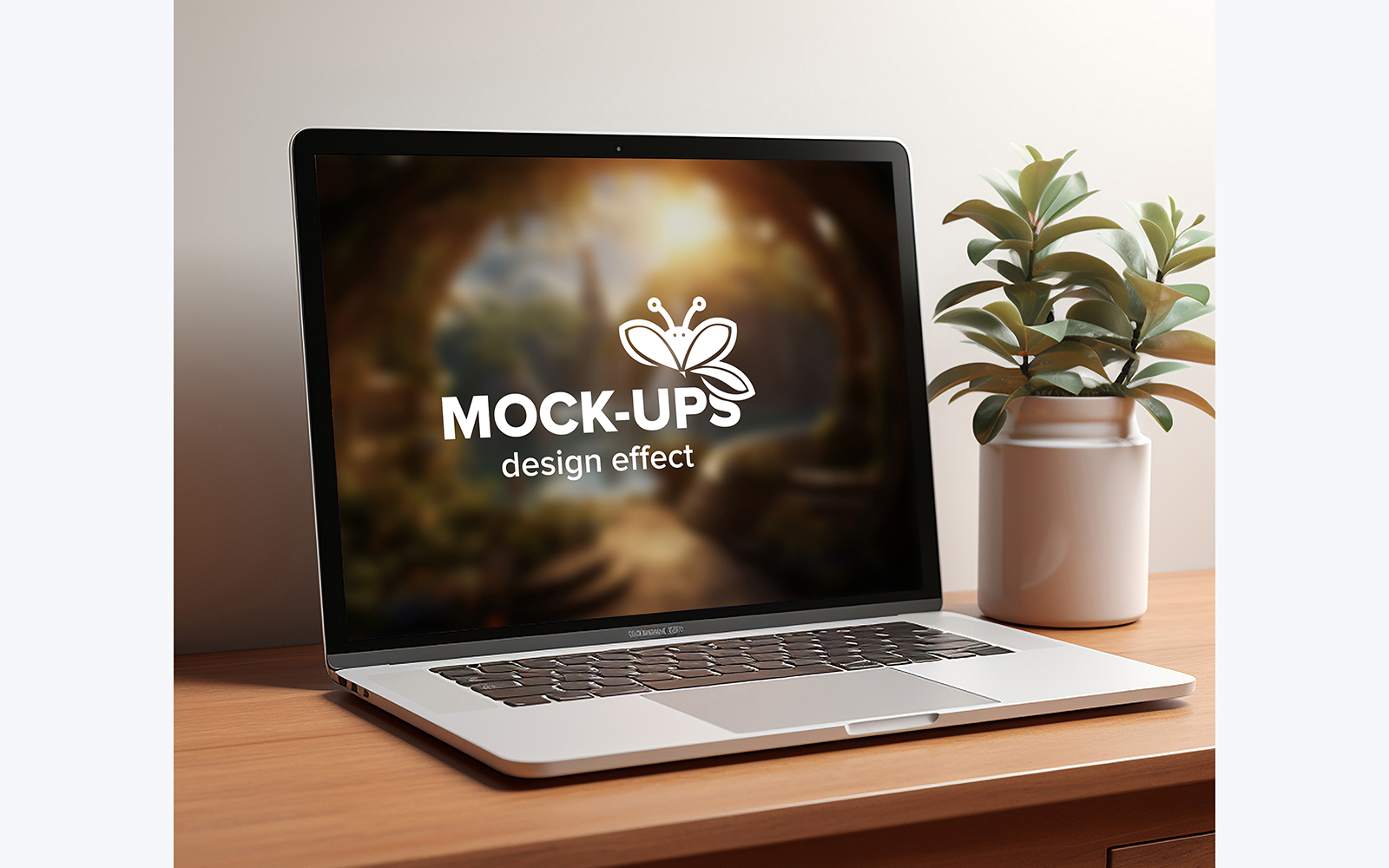 Laptop on wood table background mock up, Website template on laptop screen, Laptop mock-up isolated Product Mockup