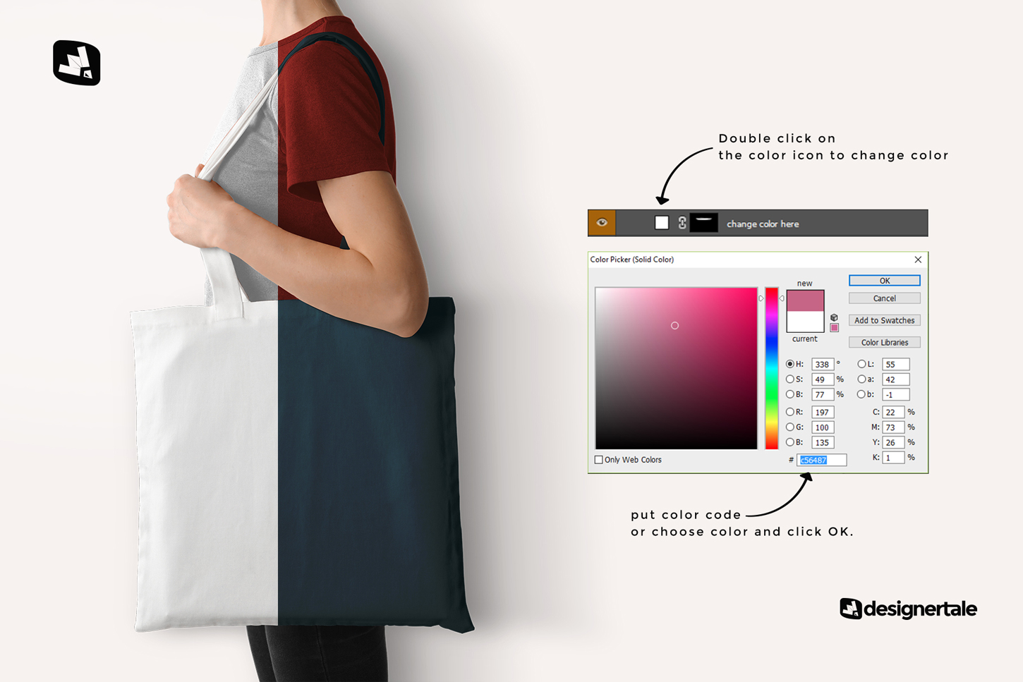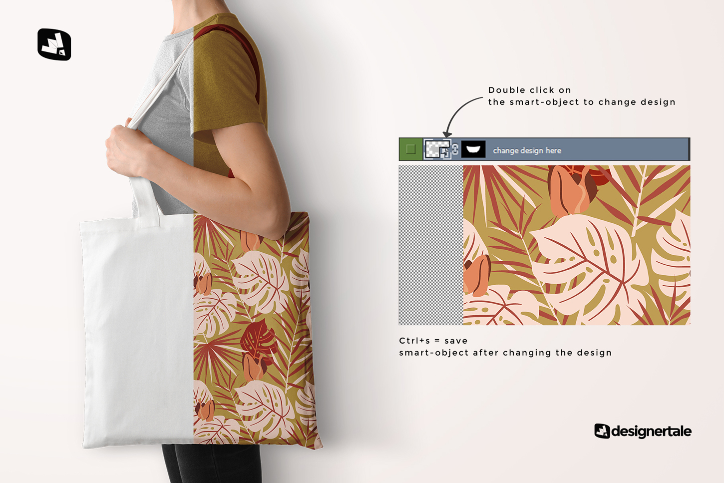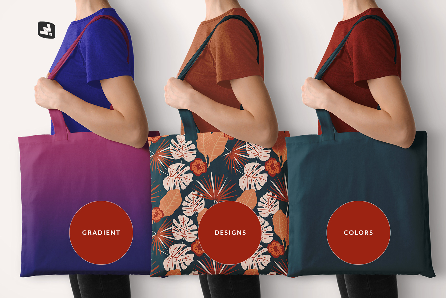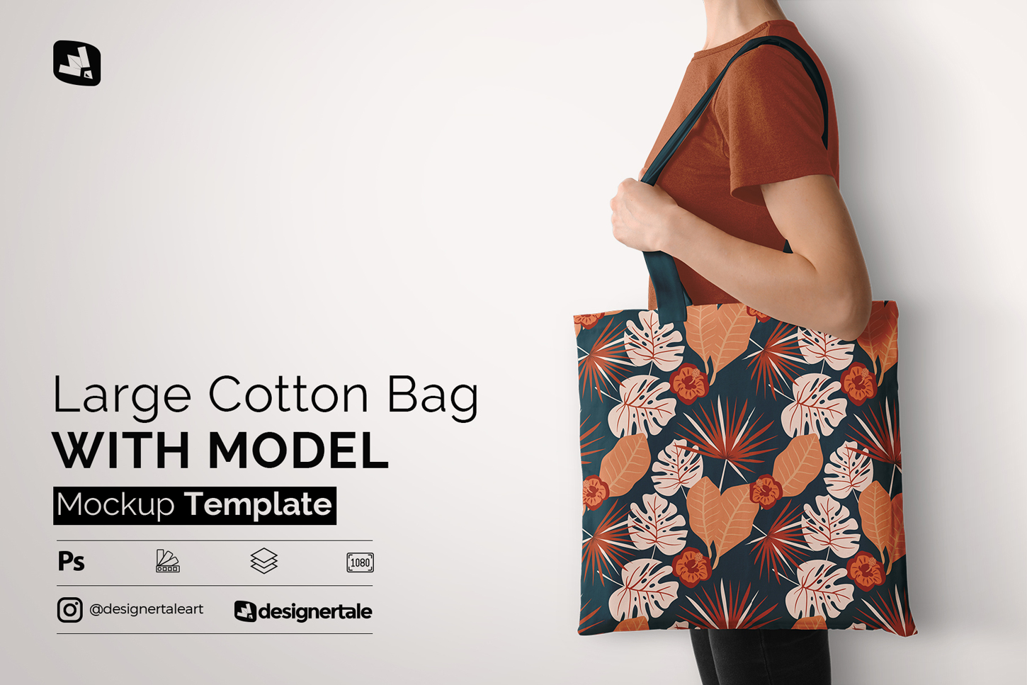 Cotton tote bags are recyclable, reusable, and great daily items to carry around. The large cotton bag mockup with model is a great choice to present your pattern designs with. This large cotton bag mockup with model is perfect for any patterns and label designs. The tote bag mockup is multipurpose and has a cotton texture which makes this cotton bag mockup very photorealistic. This bag mockup works on any background. It has color-coded, organized layers to save your time. The use of smart-objects and design shortcuts makes creating a presentation piece of cake. The base image is high-resolution and a detailed instructional video is provided to make the work process smoother.