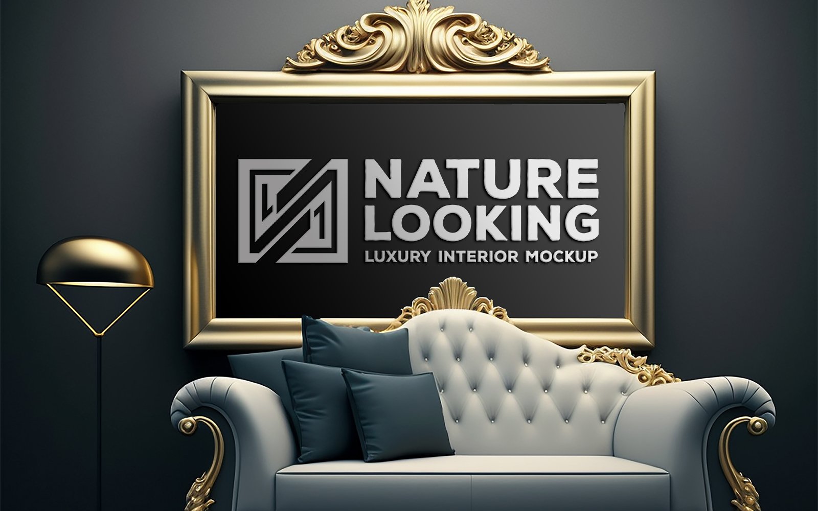 Luxury board mockup with luxury sofa_gold border board mockup with sofa_gold border frame mockup Product Mockup