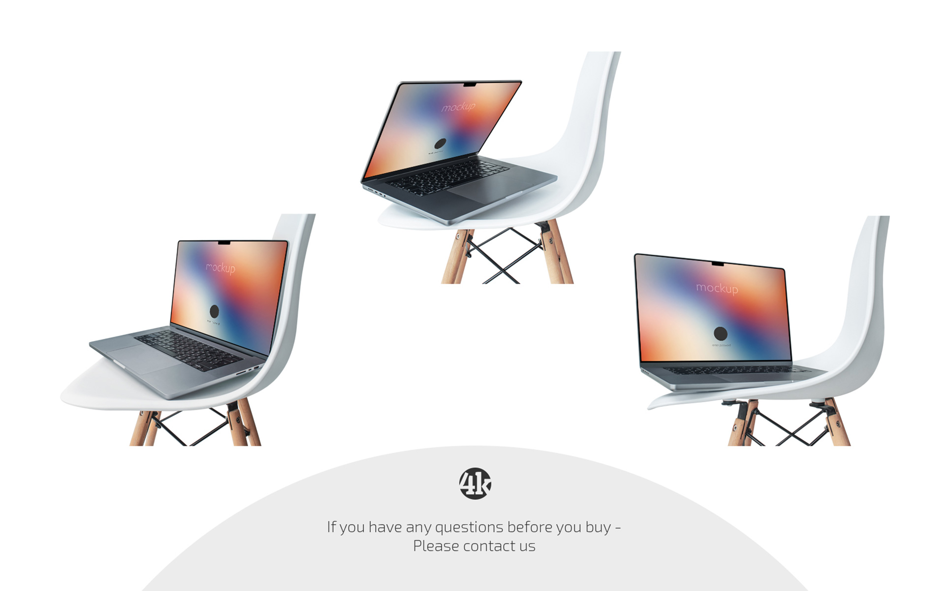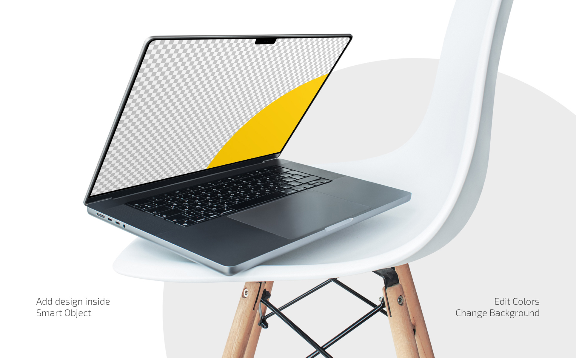 Dive into minimalism and tech aesthetics with a tool that makes your presentation professional and memorable. Display the spirit of modern design: a balanced composition focuses attention on your interface, website or application. After all, the MacBook Pro is located on a stylish designer chair, which adds a creative accent to the scene and creates visual interest.