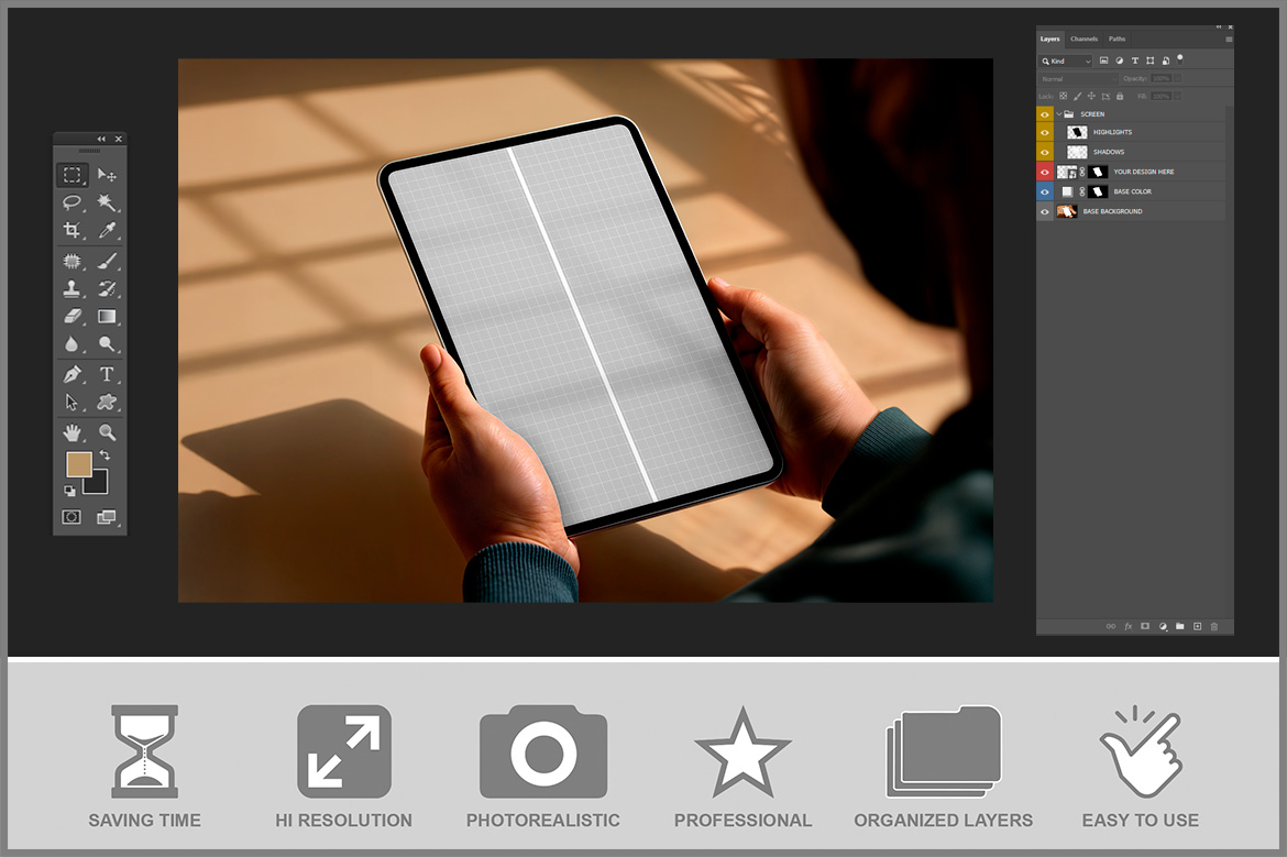 Just drag and drop into the Smart Object. With high resolution (4500 x 3000 px), this mockup is detailed, easy to use, and perfect for saving time and effort.