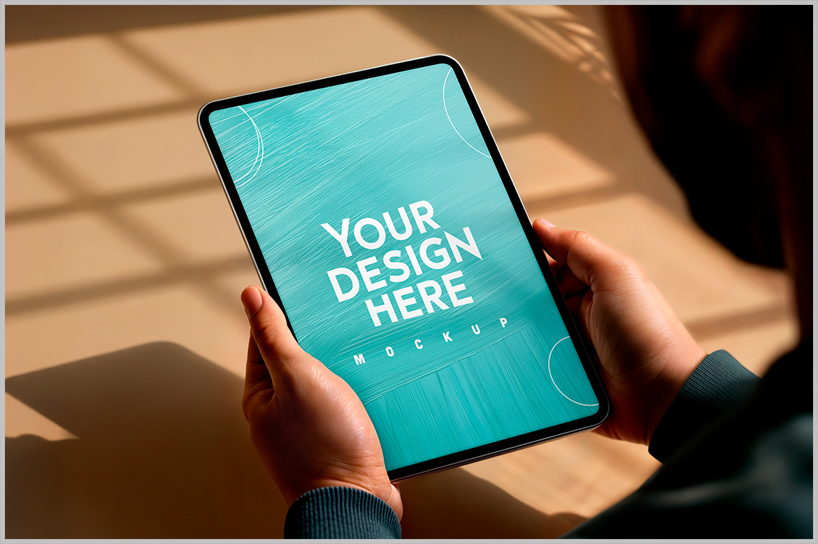 Man Holding Tablet Mockup lets you quickly apply designs using layers, masks, and smart objects.