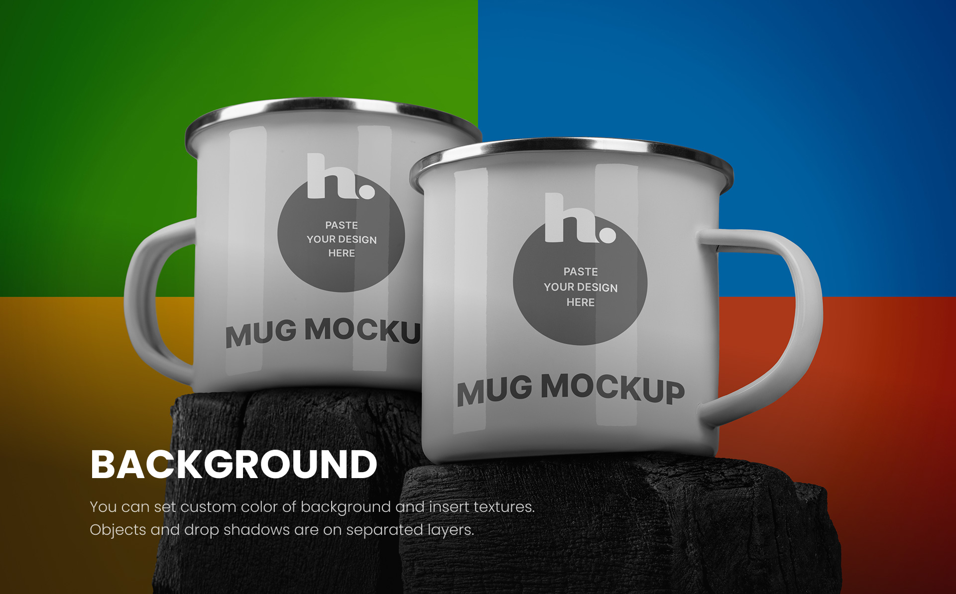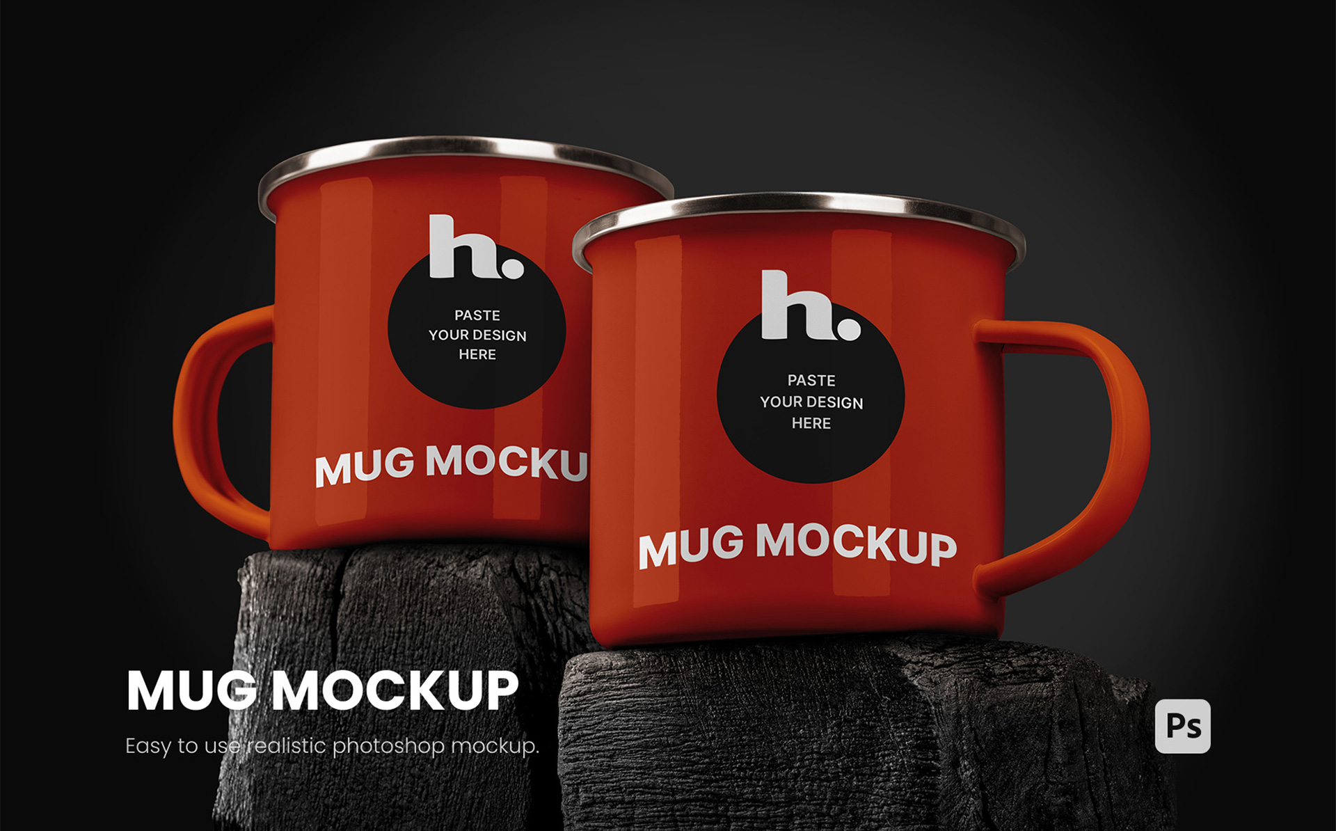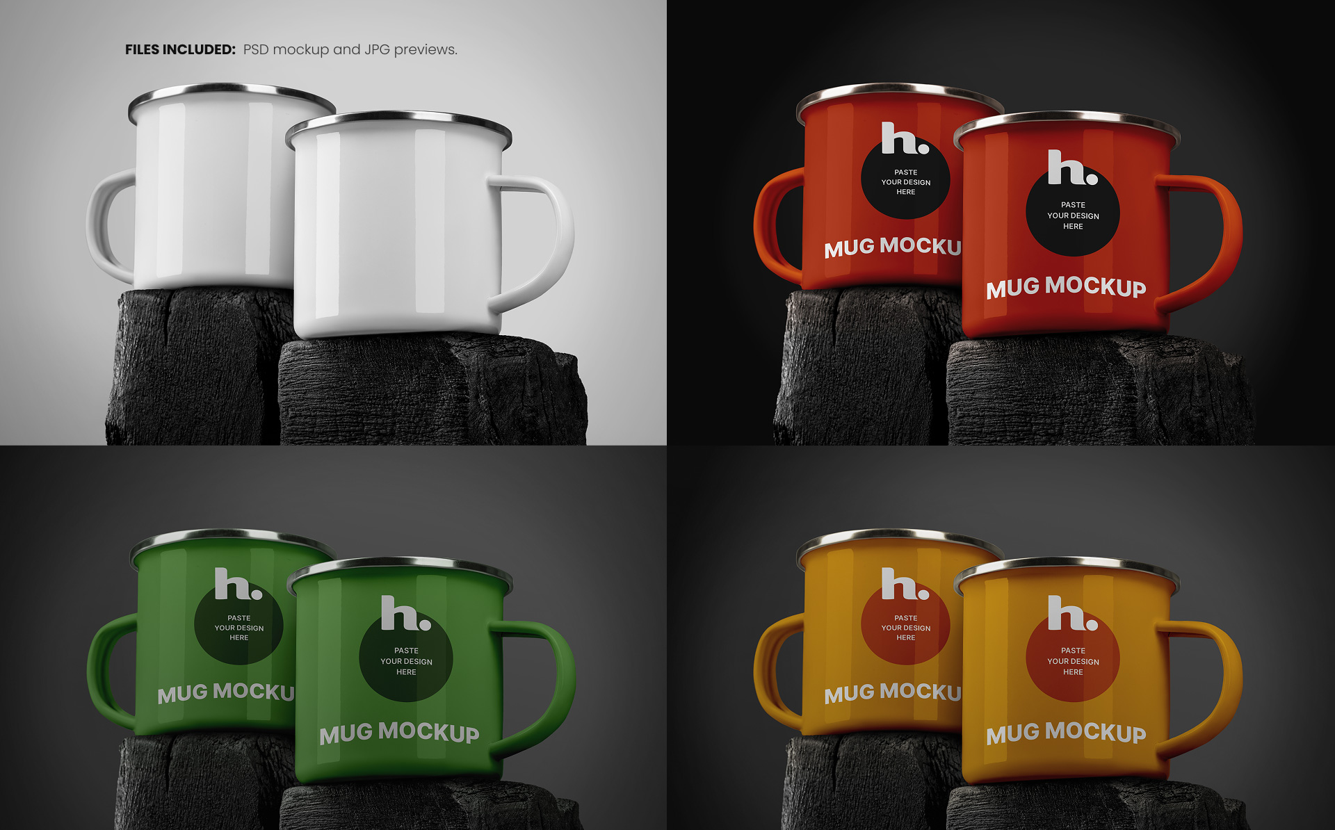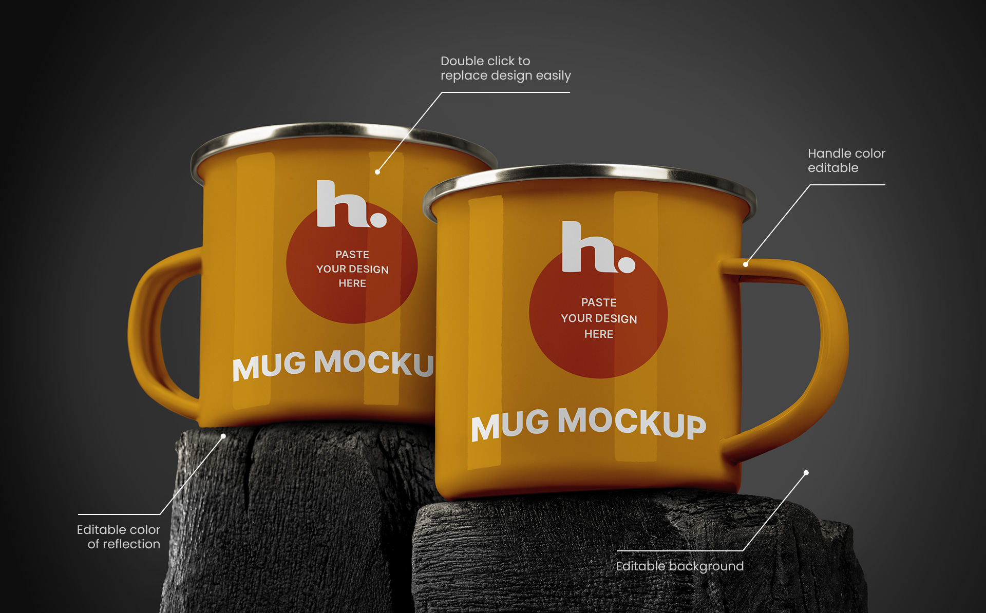 Mugs Mockup PSD - Enamel Mugs on the Blackstone Product Mockup