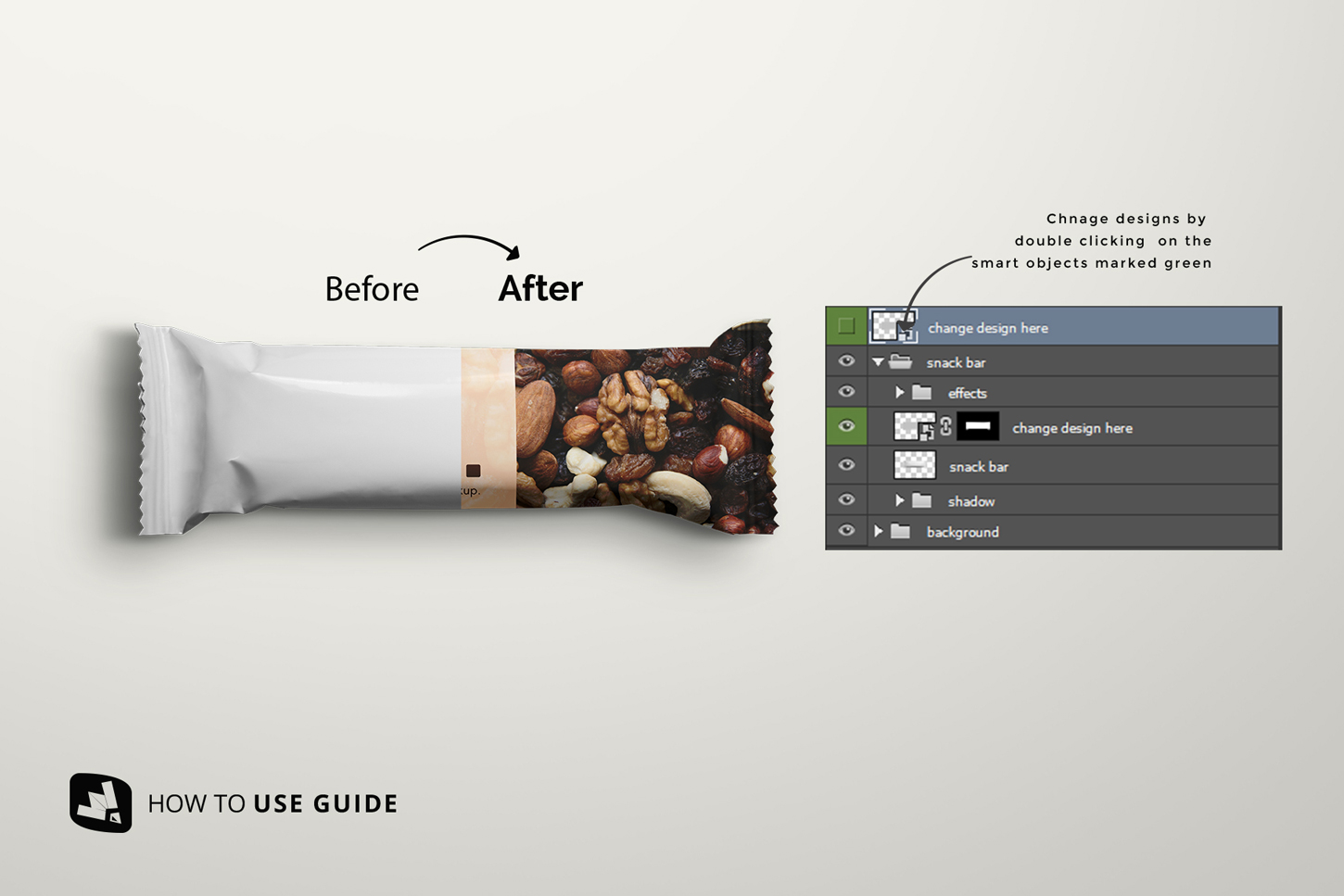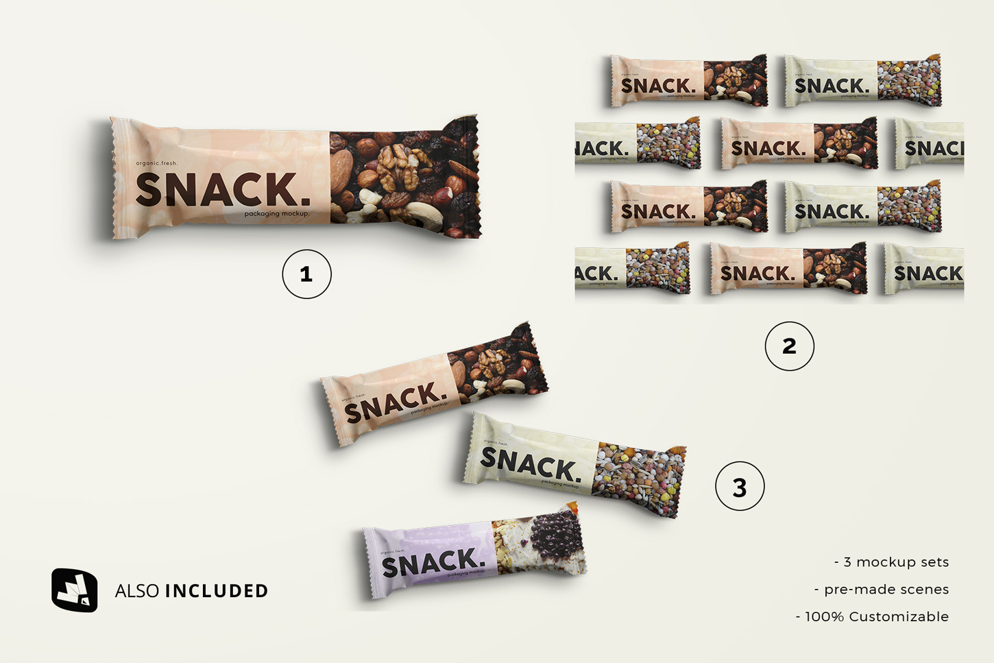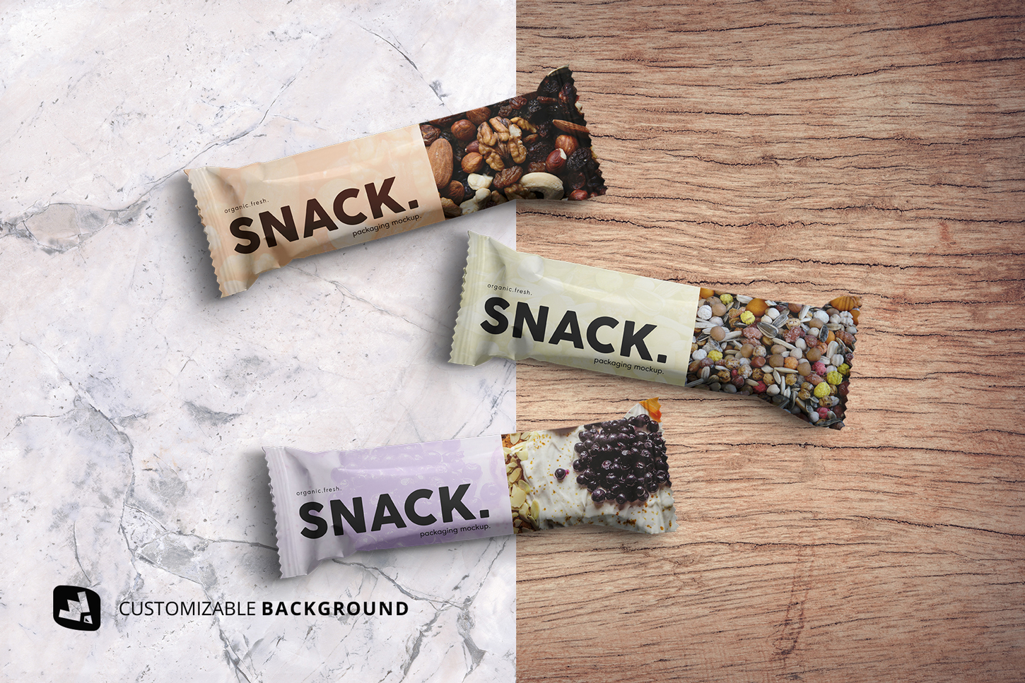 Snack bars are made with superfoods. They help us stay fit and energized before, during and after workouts. This organic snack bar packaging mockup is a perfect way to showcase your packaging label designs. This organic snack bar packaging mockup is simple and effective. The packaging mockup comes with 2 multiple set mockup files. This branding mockup is high resolution and has great photorealistic effects to make your designs look more relatable. The layers are highly organized and color-coded. A detailed instructional video is provided with the mockup to make your work process easy and short; which makes this snack bar packaging mockup a collective item to have in hands.
