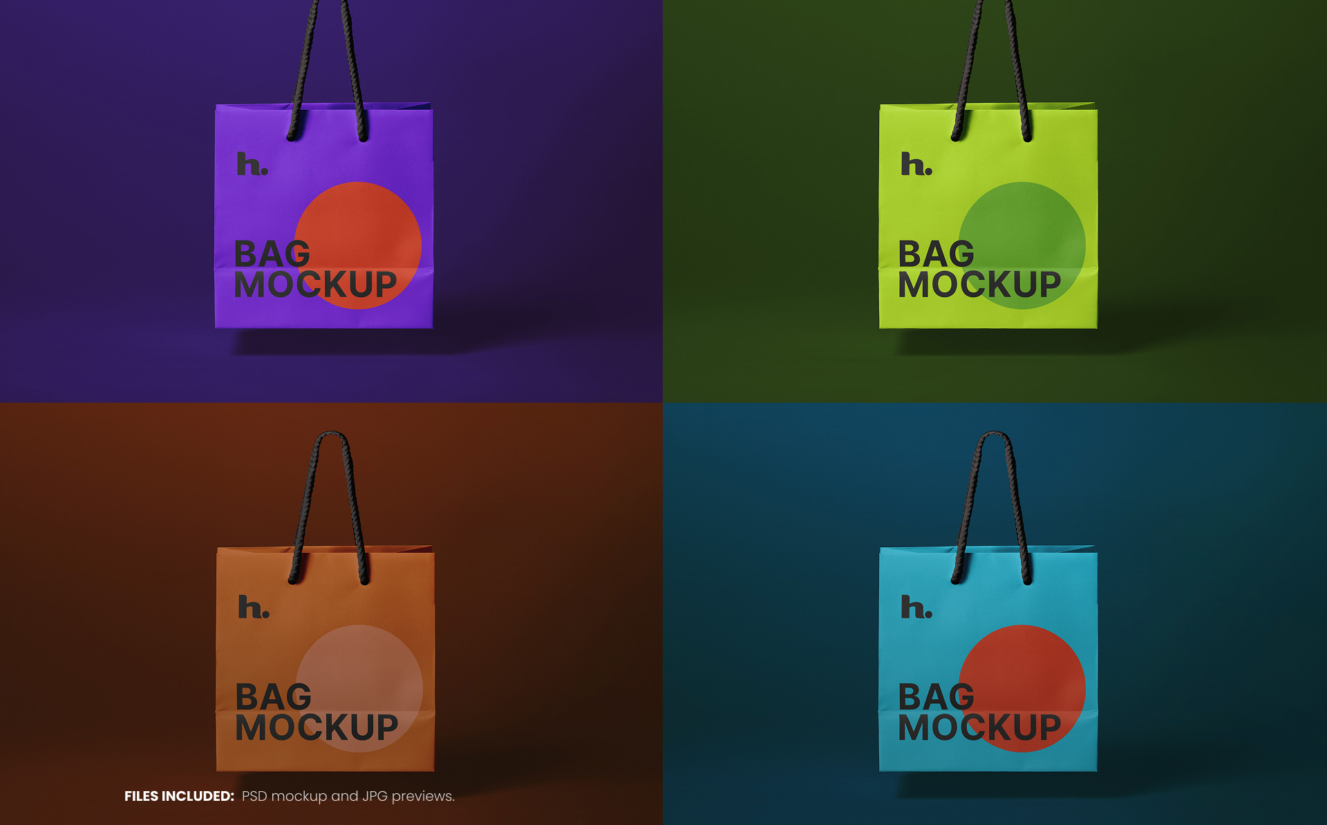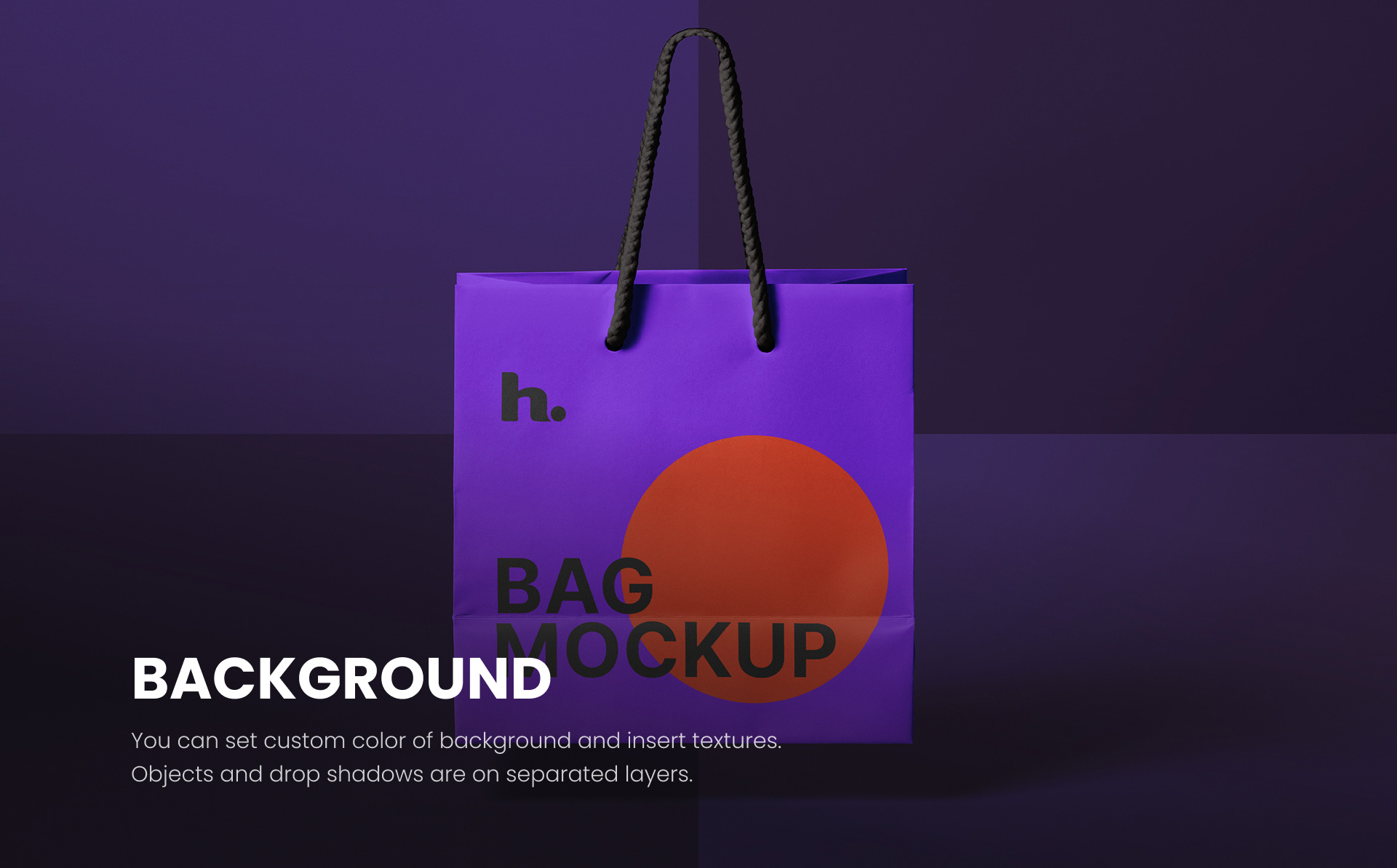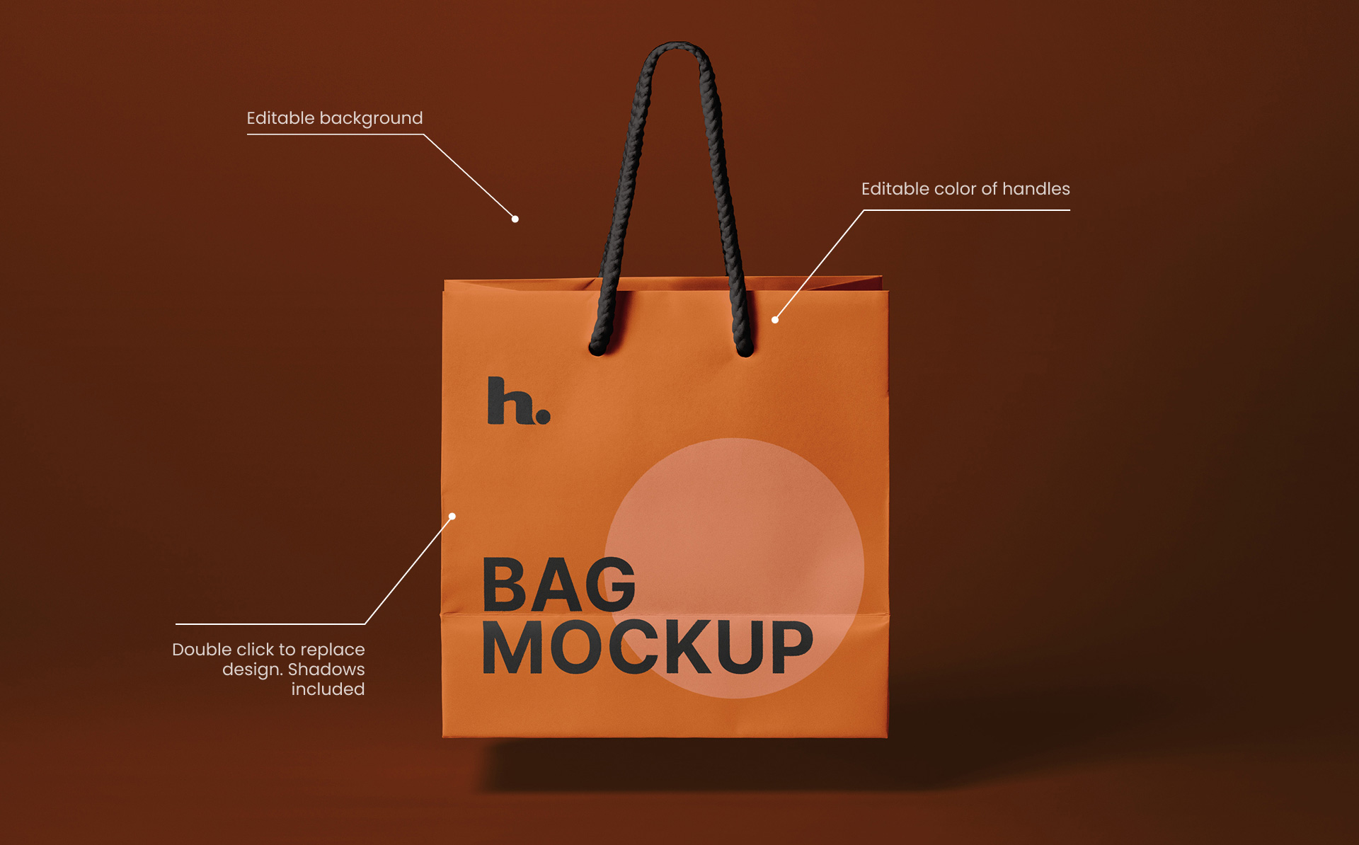 Easy to use PSD mockup of realistic paper bag with handles. Editable background with shadows included. High-quality mockup! Show your art work, place your design in just a few clicks! Use this mugs mockup to display your personal designs and art works. A huge time saver and easy way to showcase your works.