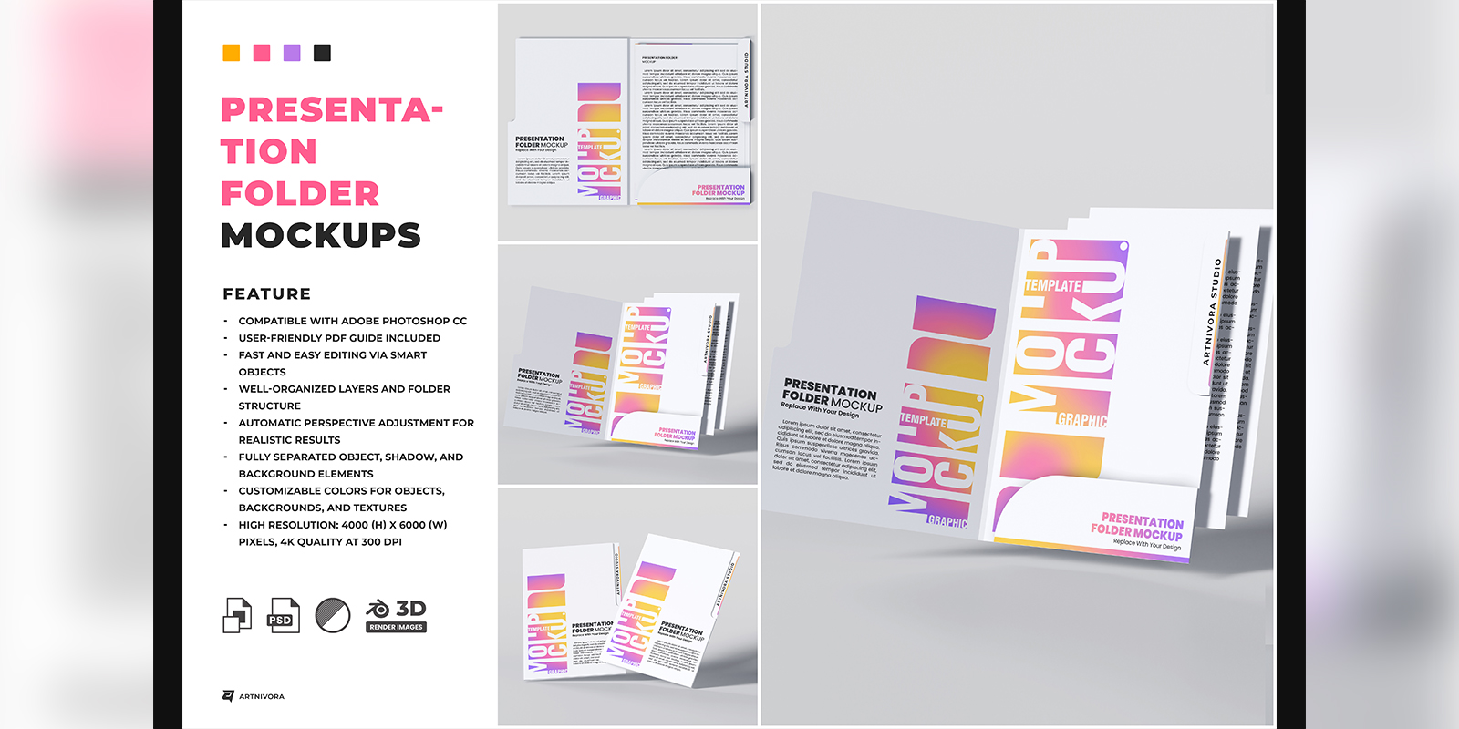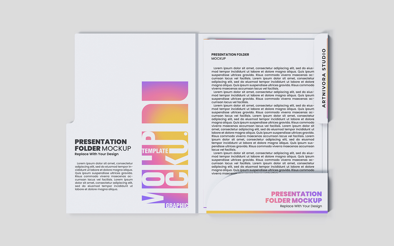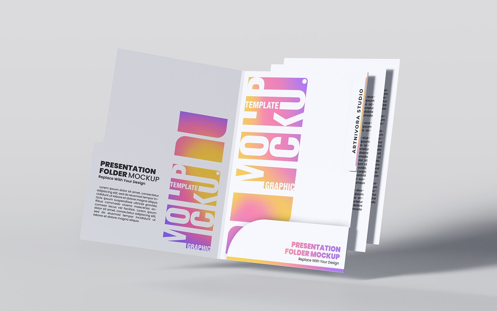 Present your folder designs in a realistic and professional style with this Presentation Folder Mockup Set. Easily add your artwork using Smart Objects—just drag and drop your design. All elements are fully customizable, giving you complete creative freedom.