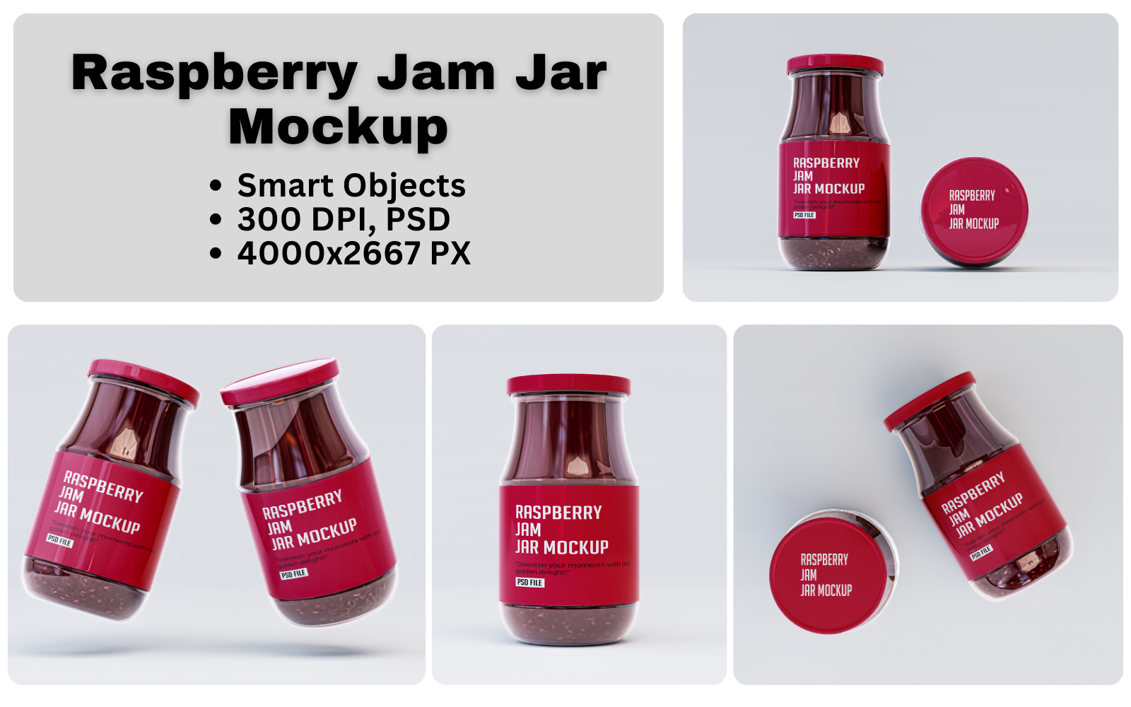 Showcase your design with this Raspberry Jam Jar Realistic Mockup . This photorealistic PSD templates is fully editable. With smart object included you can edit the layers of the graphic canvas or remove them completely and place your own graphics inside, without worrying about perspective, light and shadow effects. Here we showing 6 models for your product branding help.