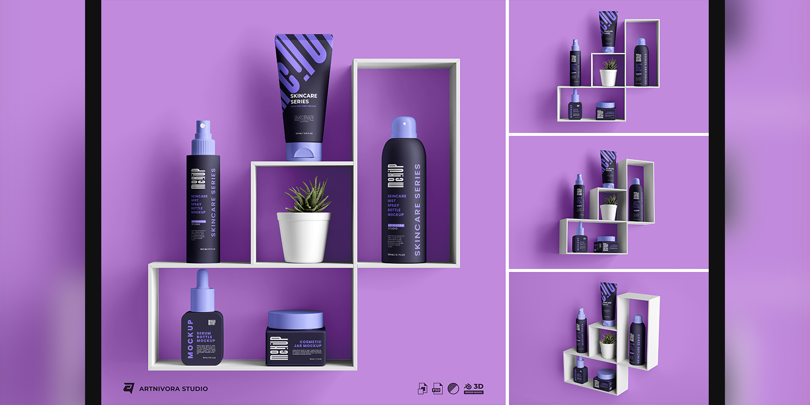 Showcase your skincare brand designs with these premium-quality Skincare Product Packaging Mockups. Each mockup features a clean, minimal shelf display, perfect for presenting cosmetic packaging such as bottles, tubes, and jars. Easily customize every detail using Smart Objects—simply drag and drop your artwork for instant, professional results. All color elements are fully editable, and each object is separated from the background for maximum flexibility and creative control.. Designs and fonts used in preview images are for demonstration purposes only and are not included in the final files.