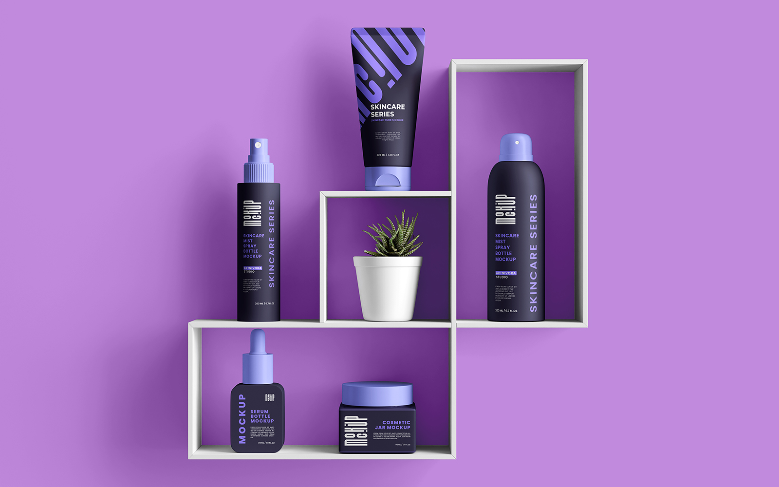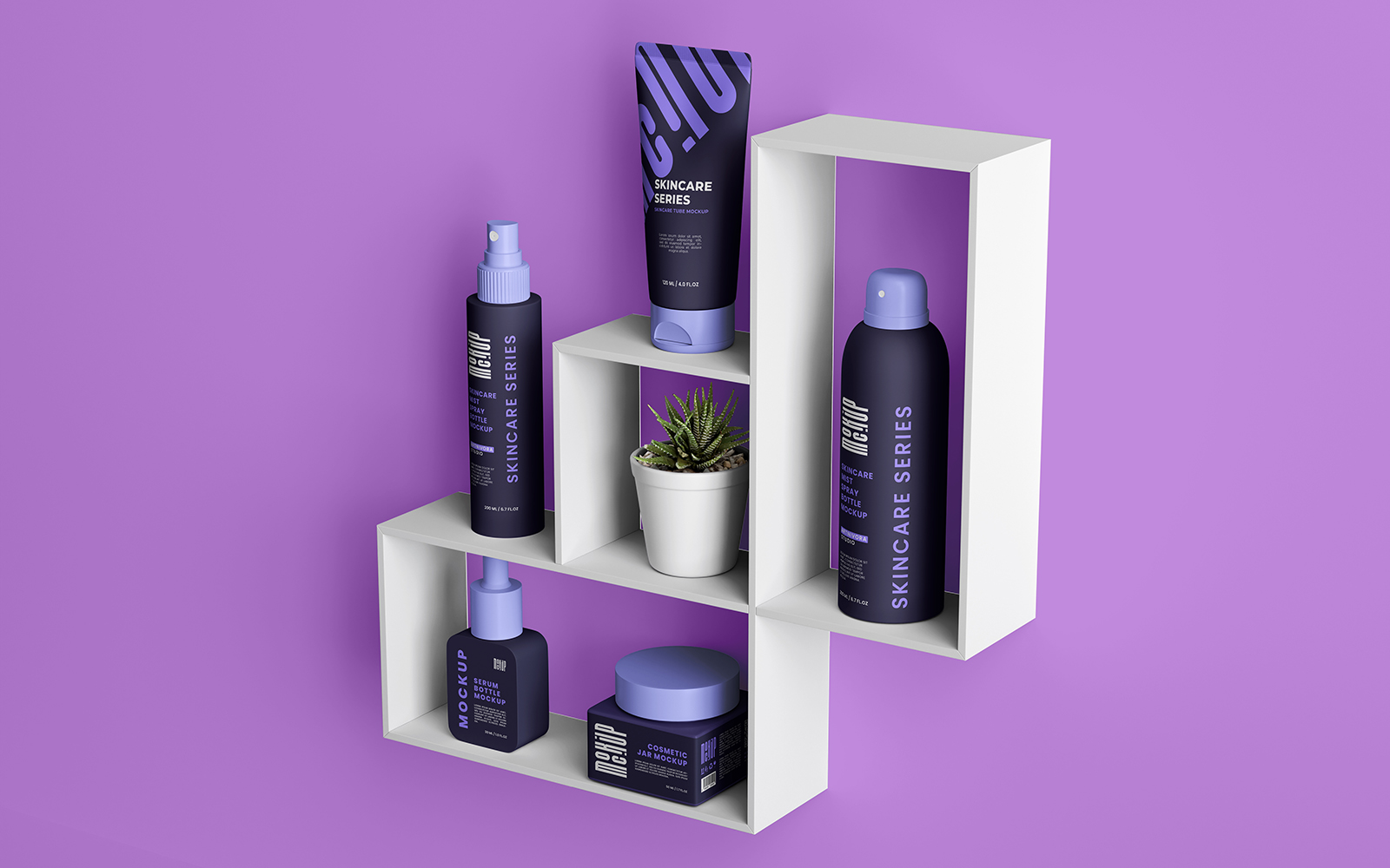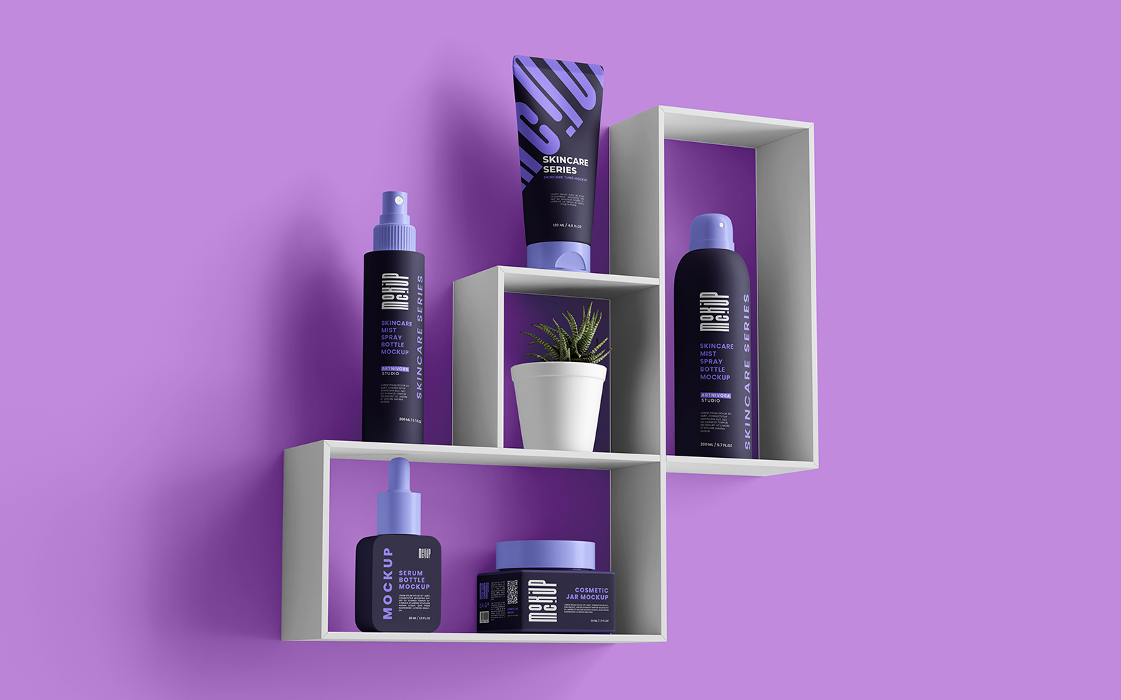 Skincare Product Packaging Mockup Set on Minimal Shelf Display