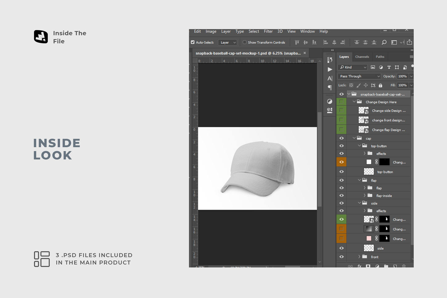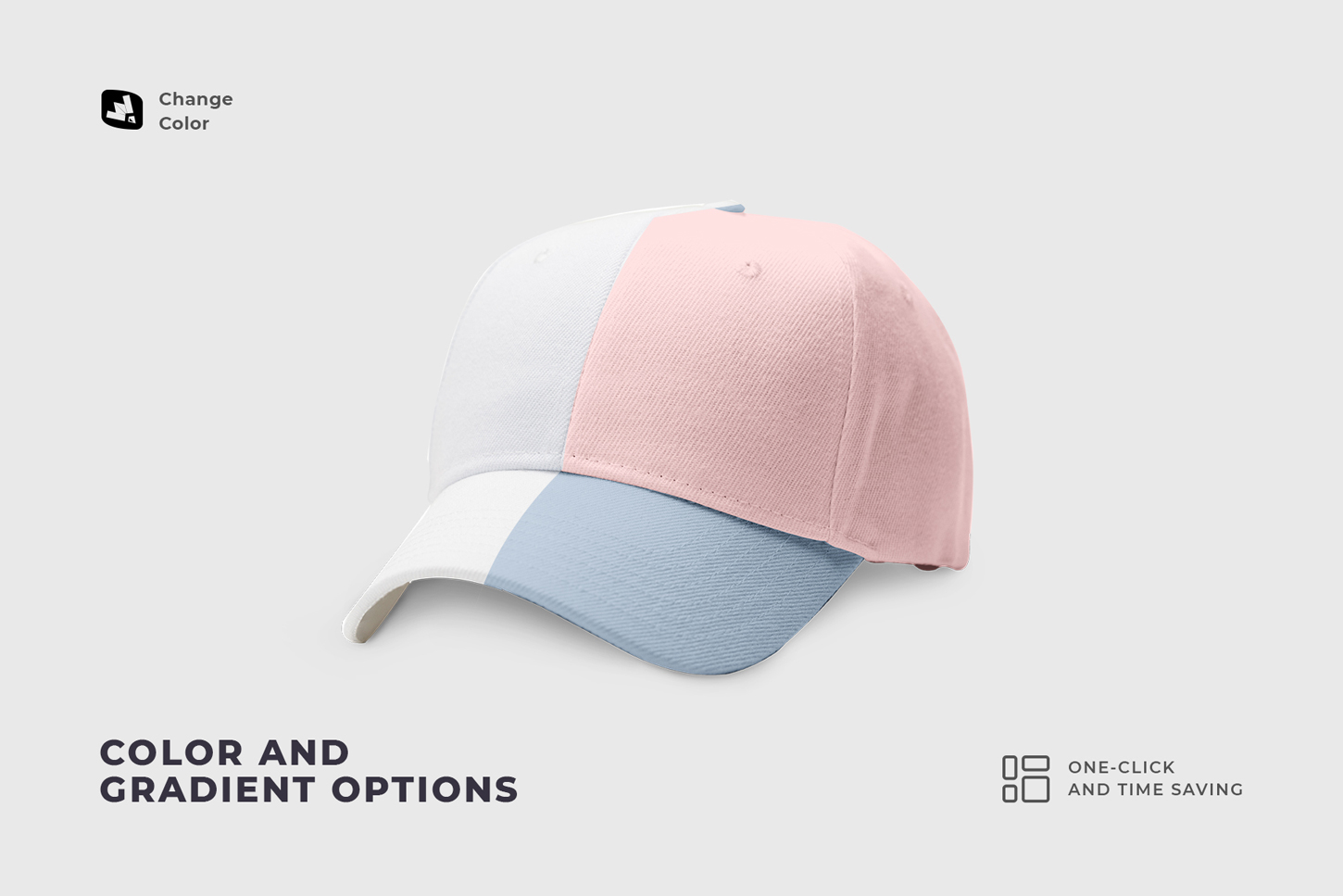 Set of snapback baseball caps mockup template. The files provide three different aspect shots of a baseball cap. The apparel accessory mockup template is well-organized for user ease, with all of the smart components presented at the top.