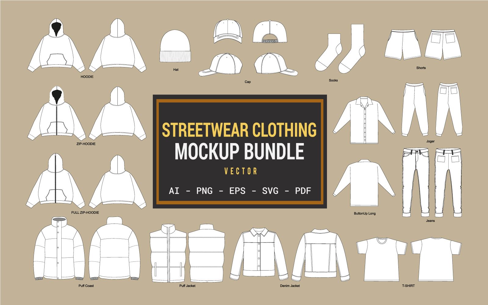 Welcome to our all-in-one Streetwear Clothing Vector Mockup Bundle Fashion Flat Design Template Illustrator Vector Tech Pack Blank Fashion Technical Sketch Streetwear Flat Fashion CAD Procreate Mockup Vector Template shop!