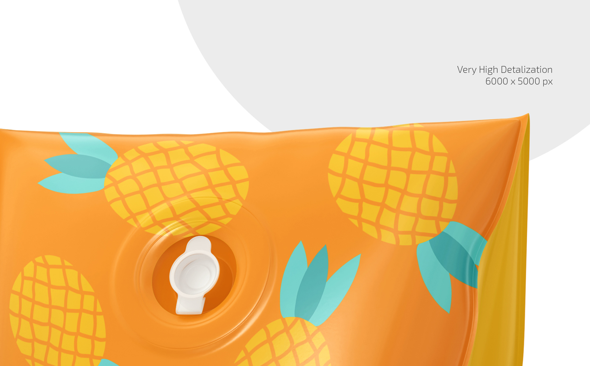 Get into the summer spirit with the perfect solution for designers who create stylish and safe swimming accessories. Our mockup features inflatable armbands, perfect for brands targeting kids or family vacations. Show off prints, logos or patterns on a three-dimensional surface while maintaining the realistic shape of the product.