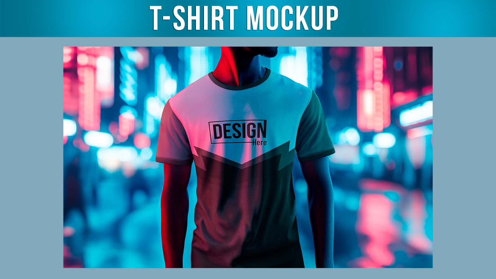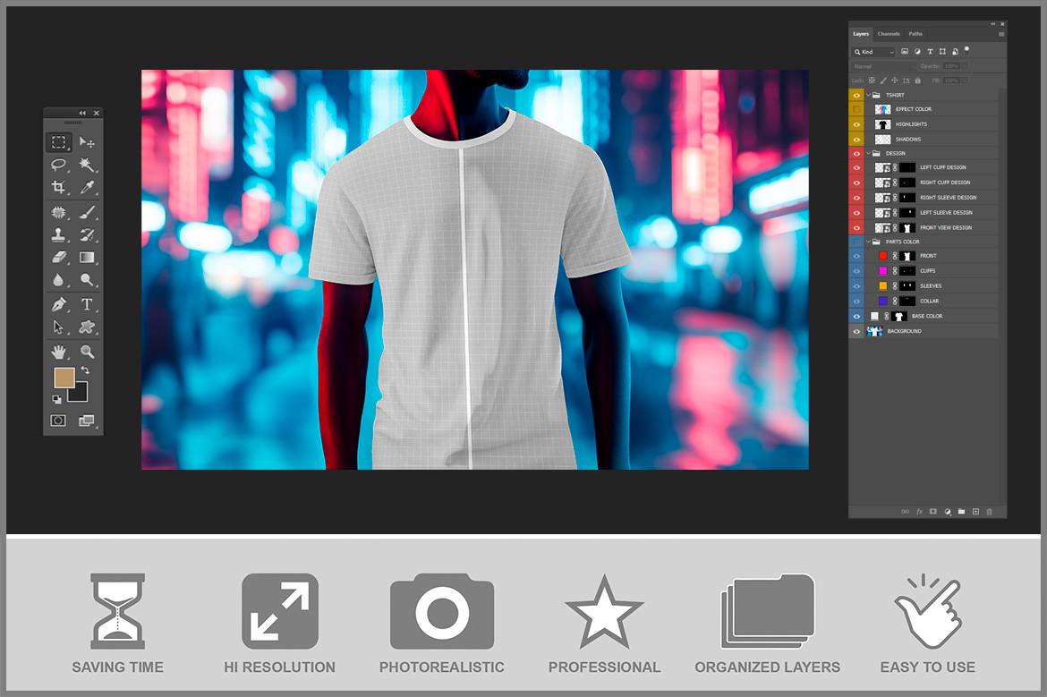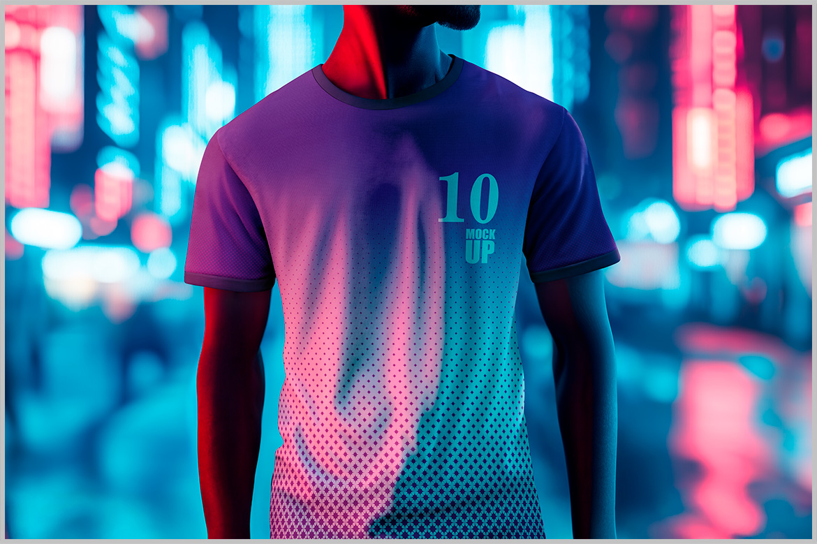 T-Shirt Mockup on Neon Urban Glow lets you quickly apply designs using layers, masks, and smart objects.