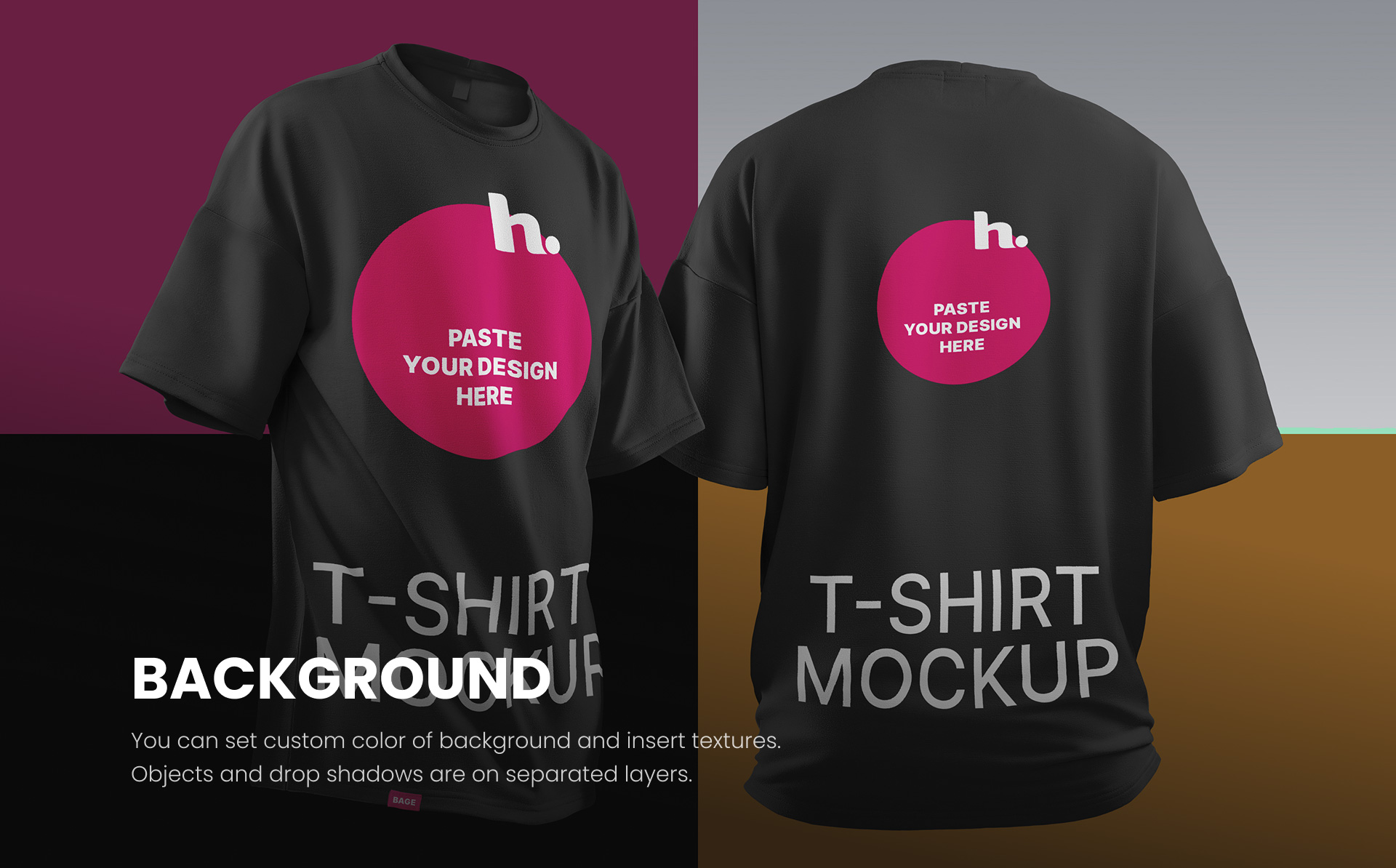 Easy to use PSD mockup of realistic t-shirt. Editable background with shadows included. High-quality mockup! Show your art work, place your design in just a few clicks! Use this mockup to display your personal designs and art works. A huge time saver and easy way to showcase your works.