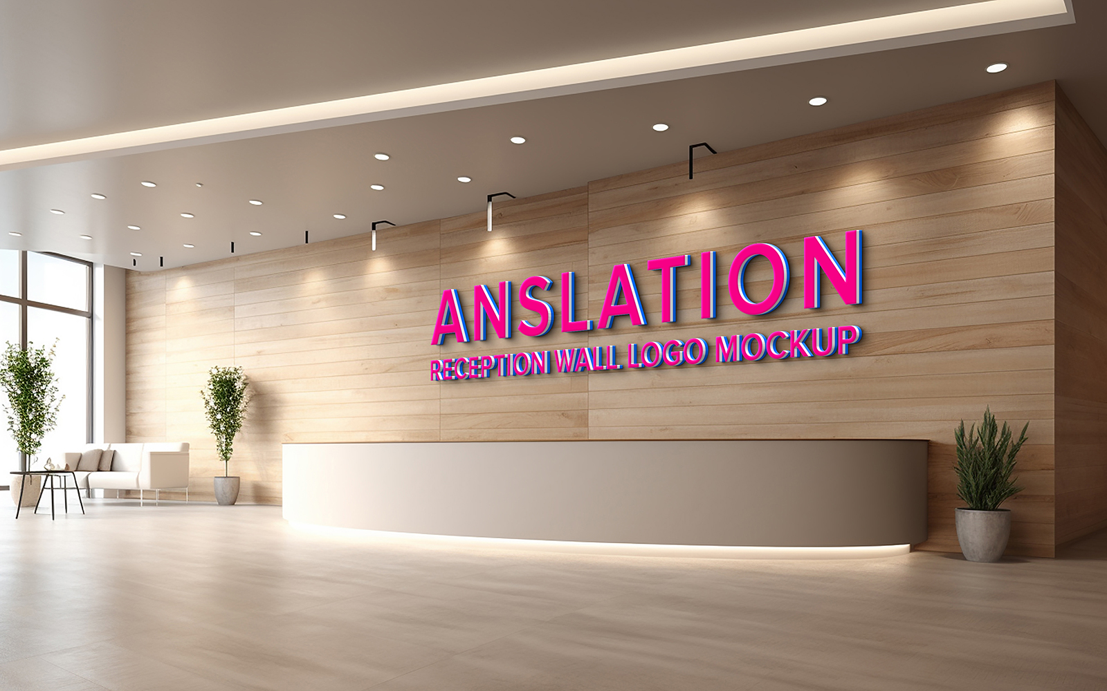 Wall logo mockup psd in the office receptionist front desk Product Mockup
