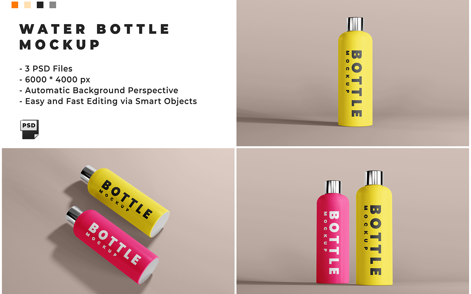 3 sets of Water Bottle Mockup, very easy to use using smart objects, all color parts are editable and objects are separate from the background.