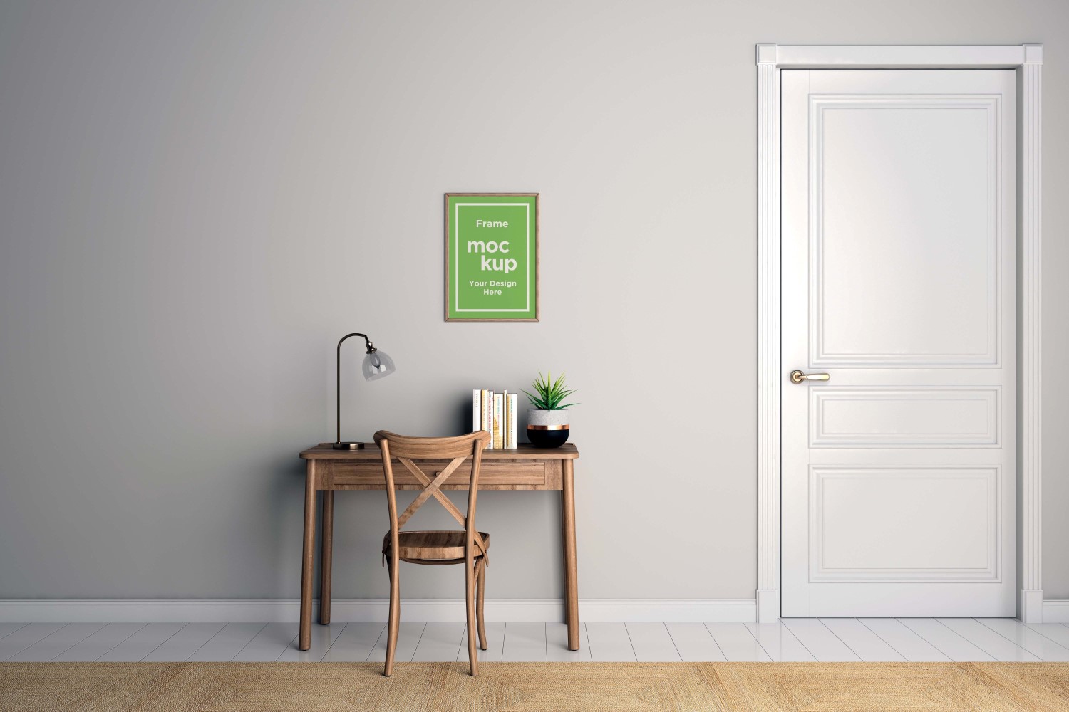 Home Office Workstation with chair, wall frame and screen mockups good to use for wall art and designs, presentations, gallery presentations and more. Created for designers, to preview their designs and artwork in a professional and photo realistic way.