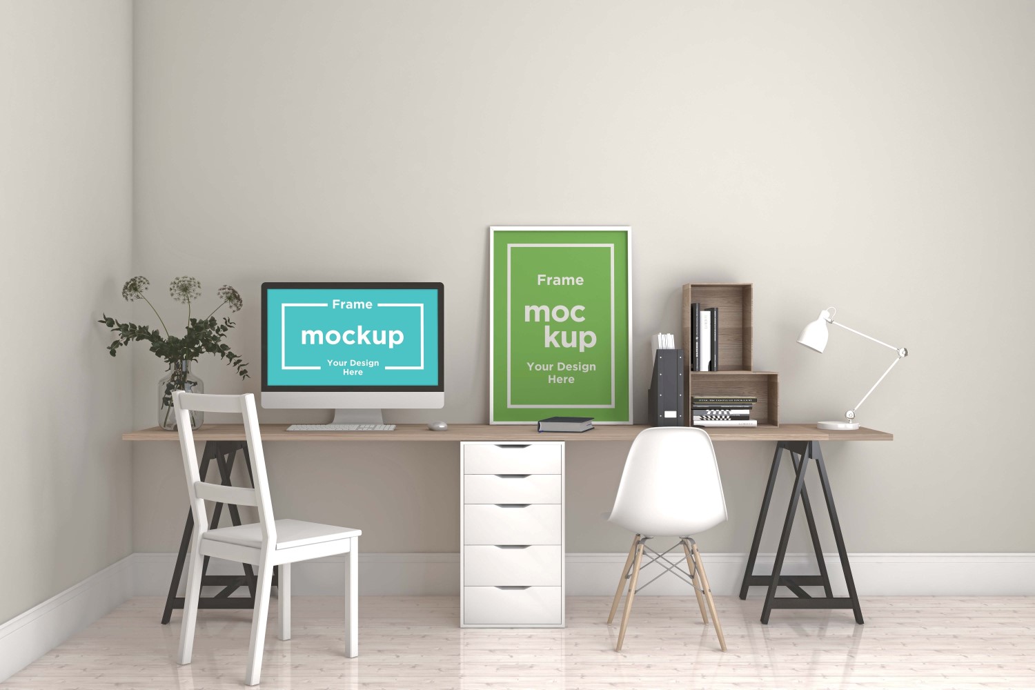 Home Office Workstation with chair, wall frame and screen mockups good to use for wall art and designs, presentations, gallery presentations and more. Created for designers, to preview their designs and artwork in a professional and photo realistic way.