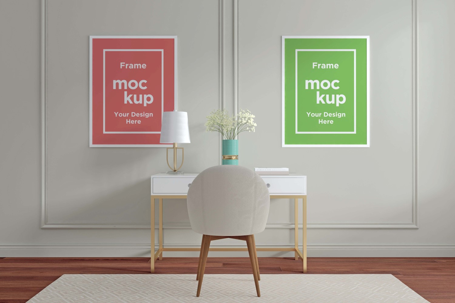 Home Office Workstation with chair, wall frame and screen mockups good to use for wall art and designs, presentations, gallery presentations and more. Created for designers, to preview their designs and artwork in a professional and photo realistic way.