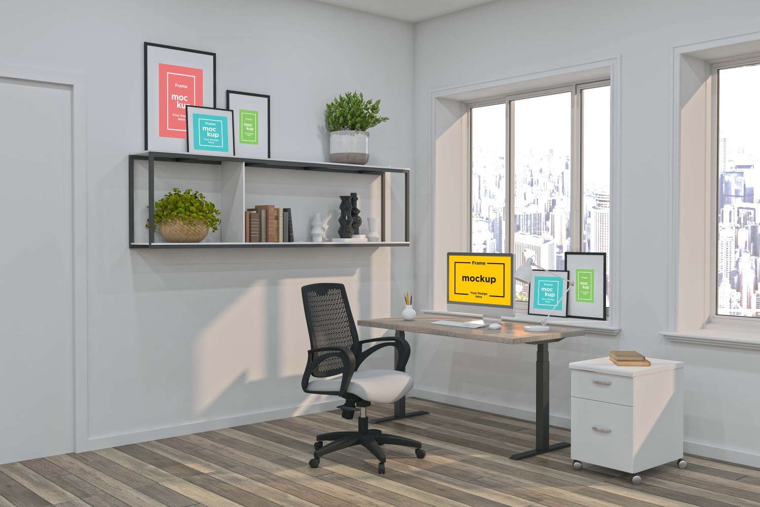 Home Office Workstation with chair, wall frame and screen mockups good to use for wall art and designs, presentations, gallery presentations and more. Created for designers, to preview their designs and artwork in a professional and photo realistic way.