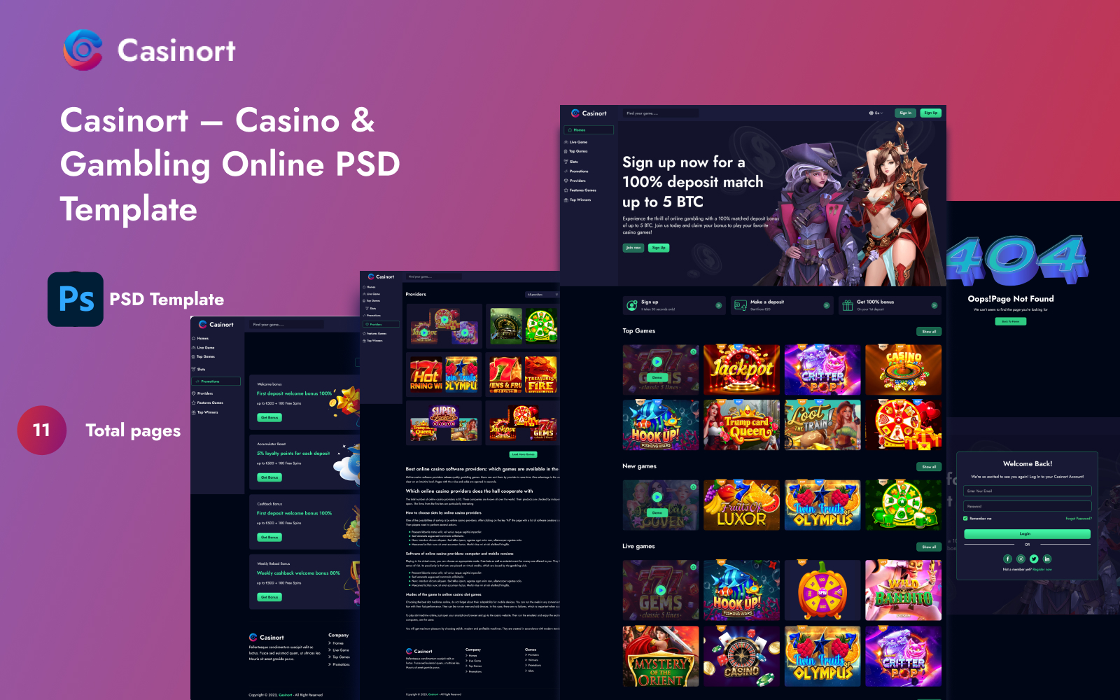 Casinort is a professionally designed Online Casino PSD Template that offers a clean and responsive layout. It includes 11 pages in PSD format, which are well-organized and named for easy customization. With Casinort, you can effortlessly modify the design to meet the specific requirements of your online casino website. The template's refined layout is adaptable and can be tailored to suit your needs. It provides a visually appealing and user-friendly interface to present your content in the most compelling way. Whether you want to showcase your games, promotions, or other features, Casinort offers the flexibility to customize and arrange the elements accordingly. The PSD files are organized and named in a way that simplifies the process of making design changes. This allows you to quickly and easily modify various aspects of the template, such as colors, typography, images, and more. Overall, Casinort is a versatile and customizable Online Casino PSD Template that provides a solid foundation for creating a visually appealing and user-friendly website for your online casino.