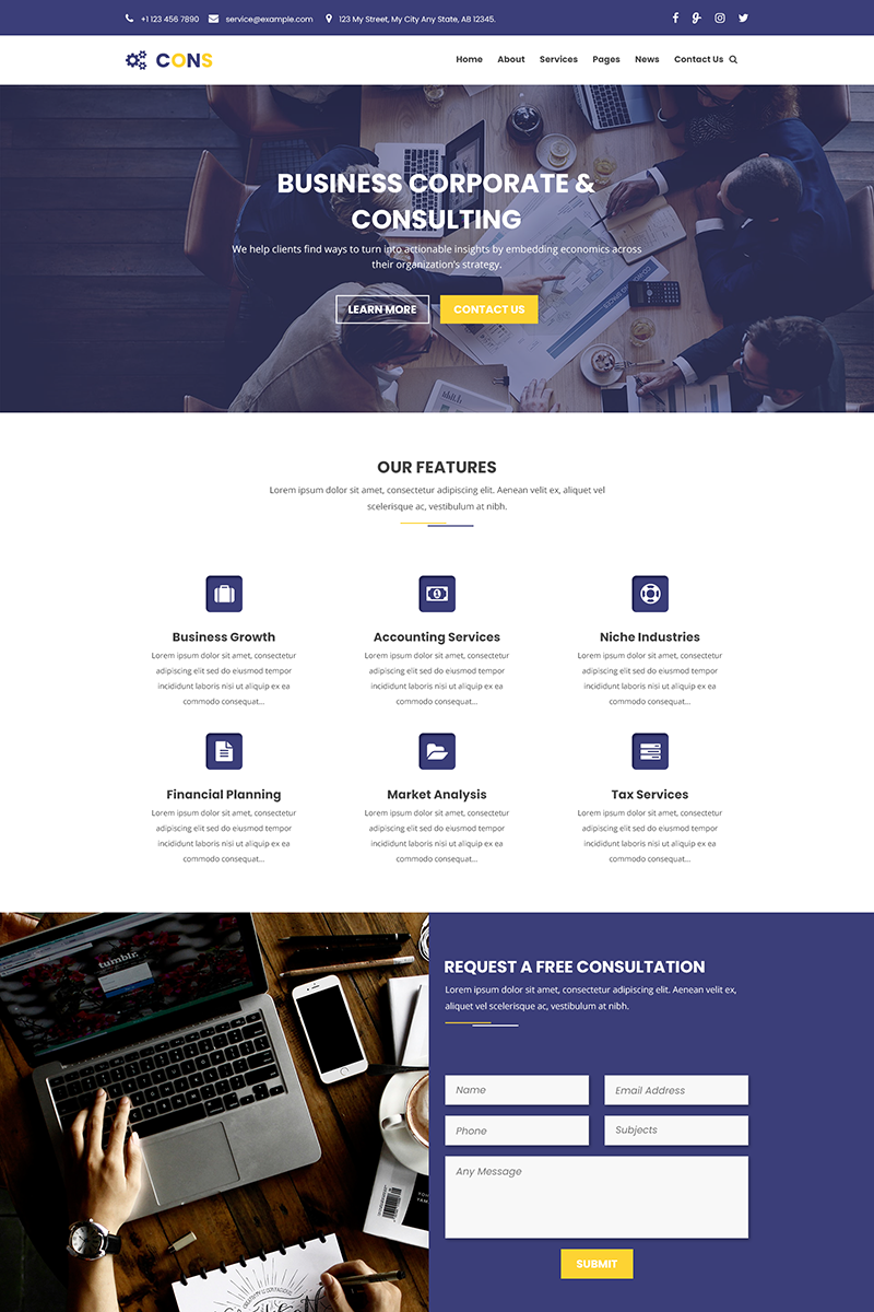 CONS - is a Corporate Business and Consulting PSD Template, suits for any type of Corporate, Agency, Portfolio, Consulting, business, creative agency, Creative, technology, work, Marketing, Studio. This is a clean and modern template with 7 PSD files included. You can customize it very easy to fit your needs.
