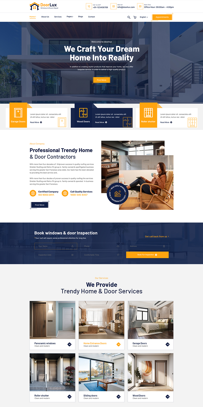 The template comes with well-organized layers and includes a variety of pre-designed pages such as home, services, about, testimonials, photo gallery, and contact pages, making it easy to set up a comprehensive website. With its professional and user-friendly design, DoorLux allows you to present your services, showcase previous work, and build trust with potential clients.